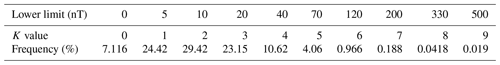 Table 2Lower limits (nT) for each K value for the Niemegk observatory (Mayaud, 1980) and frequency distribution (Matzka et al., 2021).