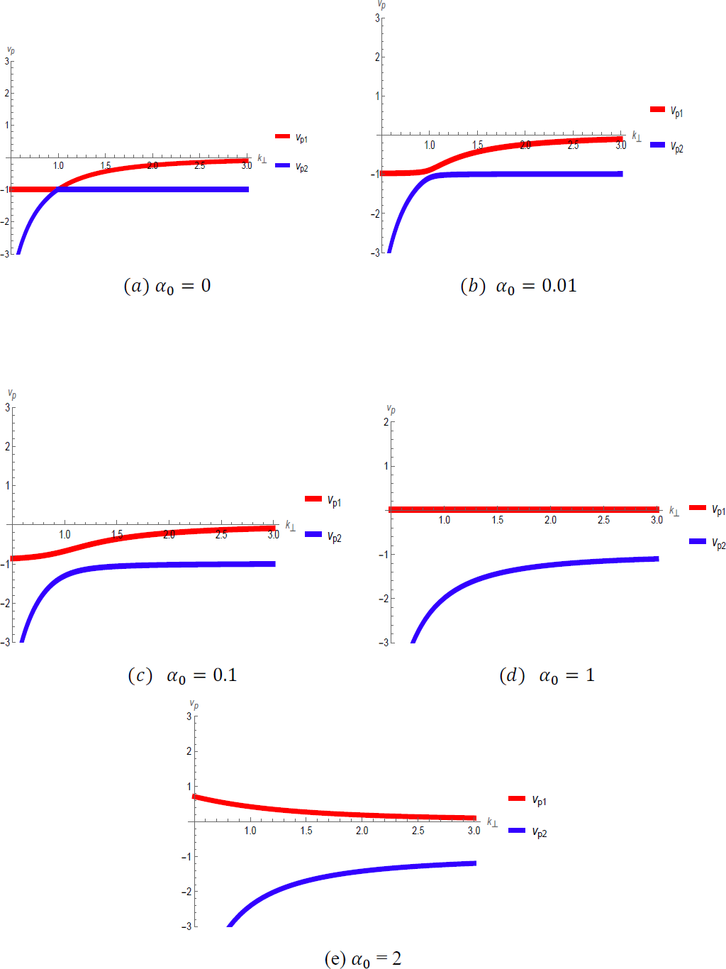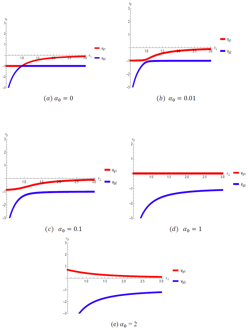 Figure 1 represents the phase velocity vp of the obtained coupled Rossby-Khantadze waves is plotted with wave number k⟂ by varying α0. Red curve vp1 is for “+” and blue vp2 is for “–” signs before the radicand in Eq. (21).