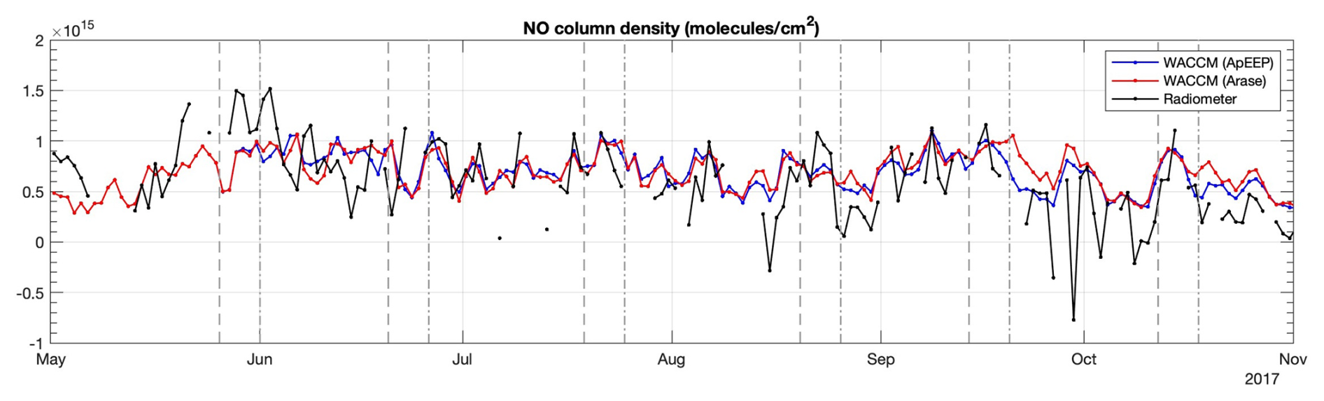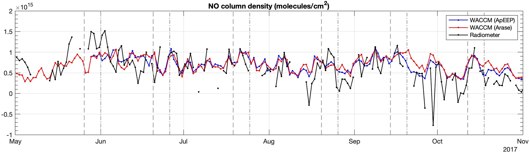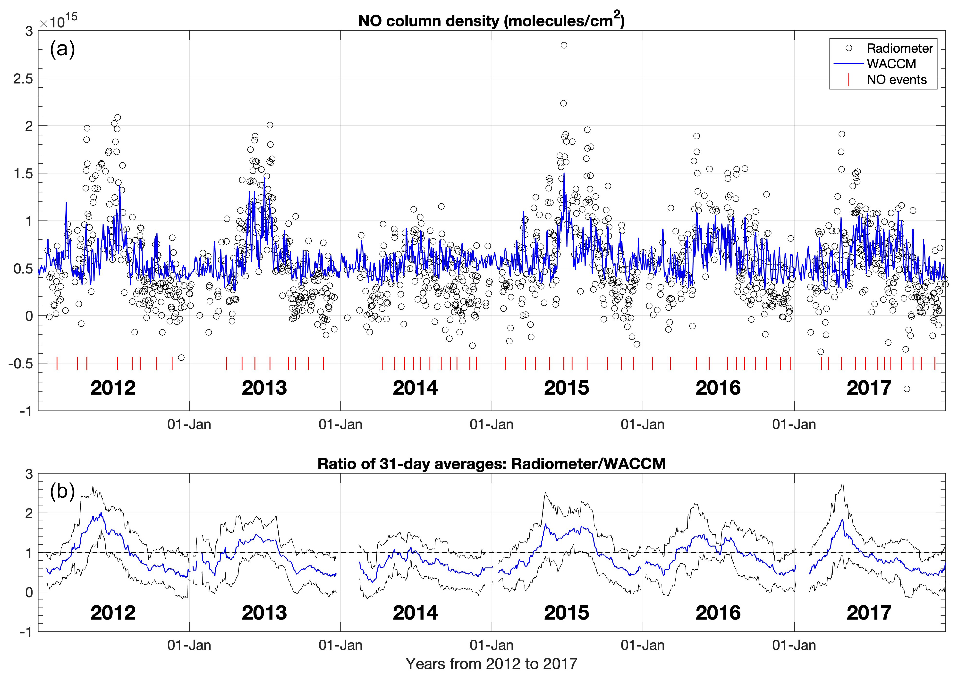 One of the open questions in EEP atmospheric impact research has been to understand the differences in both the amount and vertical distribution of NO in the mesosphere–lower thermosphere (MLT) region seen between different sets of observations and models (Randall et al., 2015; Hendrickx et al., 2018; Sinnhuber et al., 2021). Since the radiometer NO column density observations do not include information on the NO altitude distribution, they are best used to understand the overall NO content, which is a measure of the full EEP forcing in the MLT. Comparing these observations with WACCM results, and analysis of the NO altitude distribution in the model, allows us to investigate the reasons behind any differences between model data and observations. While the radiometer data are limited in altitude information, they provide a continuous local view which is not available from satellite-based observations.