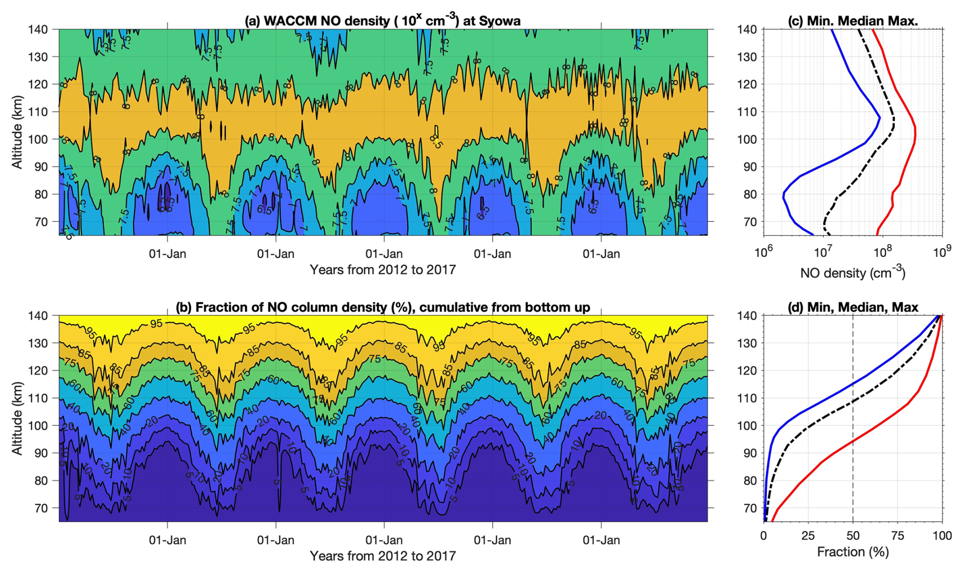 Figure 3(a) WACCM NO altitude distribution in 2012–2017 at the Syowa station location as a 7 d running average. The contour lines are powers of 10 at 6.5, 7.0, 7.5, 8.0, and 8.5. (b) Fraction of WACCM NO column density from 65–140 km altitude, cumulative from the bottom up, as a 7 d running average. The contour lines are at 5 %, 10 %, 20 %, 40 %, 60 %, 75 %, 85 %, and 95 %. (c, d) Altitude profiles of minimum (blue), median (black), and maximum (red) NO and NO fraction, respectively, over the 2012–2017 period.