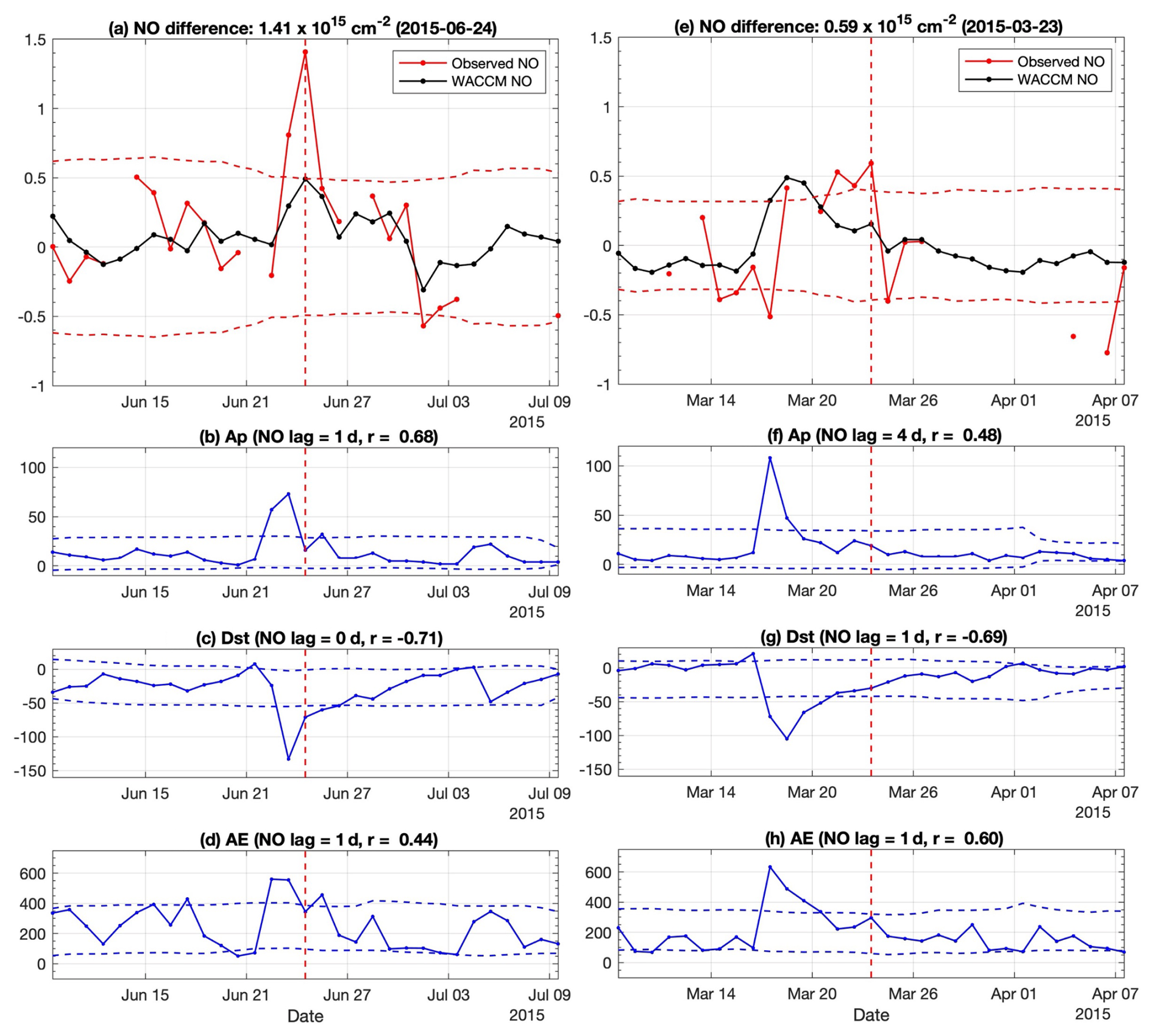 A feature seen during the March 2015 St. Patrick's Day event is that the NO increase clearly has a shorter duration in the simulated data when compared to the observations. The simulated NO and observed NO have a similar buildup until day 18. However, simulated NO has already decreased before the observed maximum on day 23. The simulated NO follows Ap, which has a sharp peak on day 17. In this case, the maximum correlation between Ap and observed NO is 0.48 with a 4 d lag. In contrast, the Dst index has a peak on day 18 and recovers slower than Ap over the following 6–7 d. Correlation between Dst and NO is largest at −0.69 with 1 d lag. Similarly, the correlation between AE and NO is stronger than between Ap and NO. Therefore, during this event the temporal behavior of NO follows the Dst and AE indices more closely than it follows the Ap.