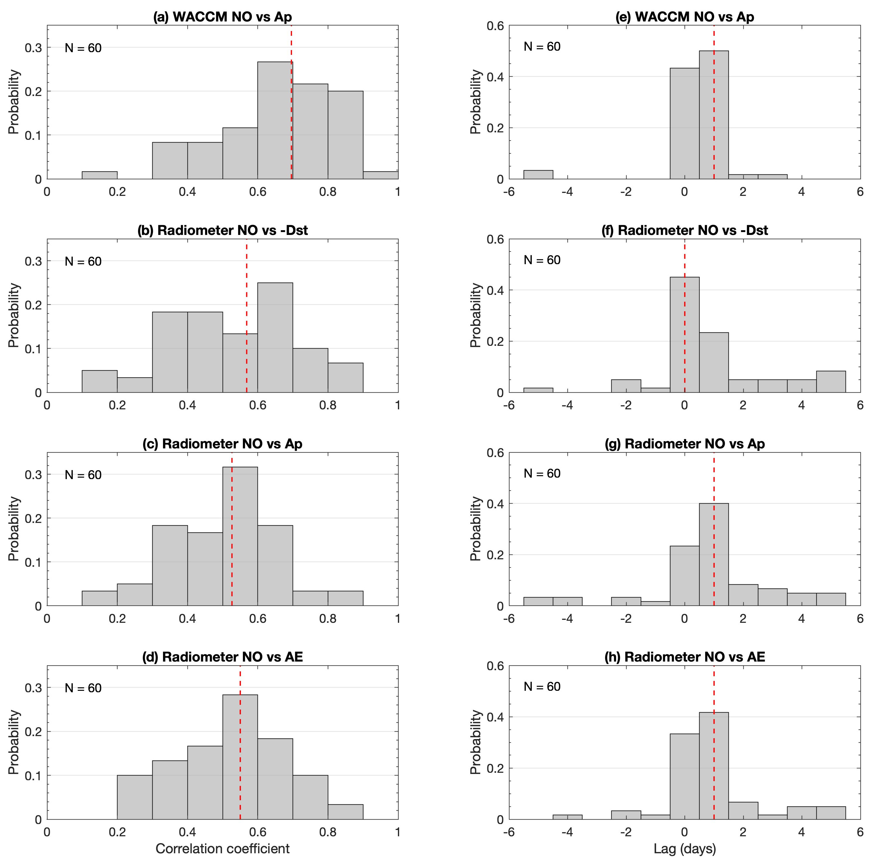 Figure 7Histograms for the NO increase events (N=60, see Table 1). Correlation (left) between geomagnetic indices and daily NO column density, with the (right) corresponding lag (days). In all panels, the vertical red line indicates the median of 60 events.