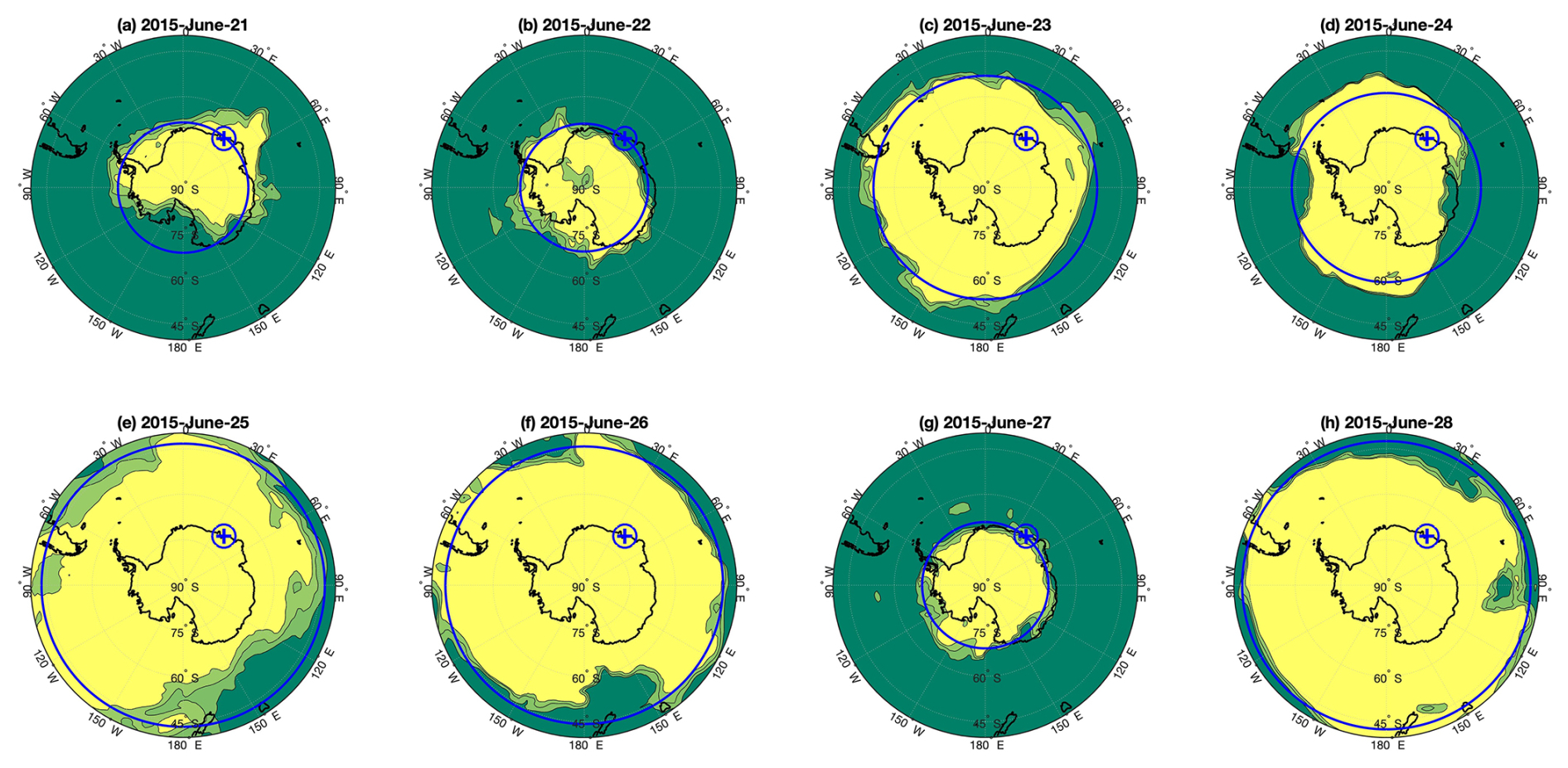 Figure 10Polar vortex edges calculated from WACCM CO data for selected days around event #1 (peak NO day: 24th). Yellow, light green, and dark green areas are inside, on the edge, and outside of the vortex, respectively. The blue cross marks the Syowa location, and the large blue circle is at the equivalent latitude of the polar vortex area. Latitudes larger than 40° S are shown.