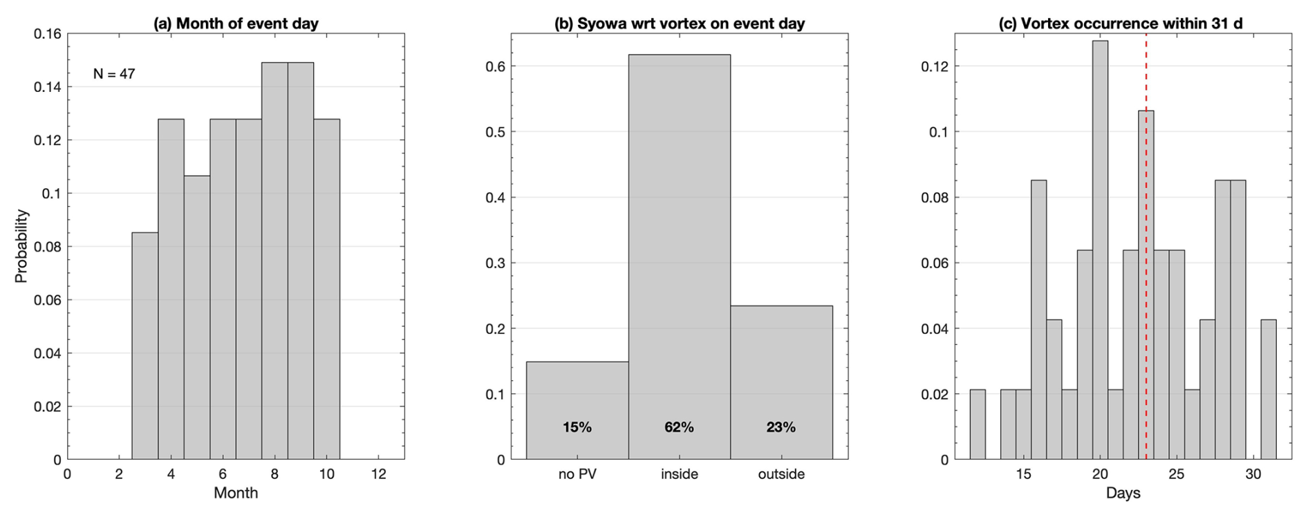 Figure 11Histograms for NO increase events (N=47; the vortex is present on at least 1 d within the 31 d period surrounding the event). (a) Monthly distribution of NO peak day, (b) Syowa location with respect to the polar vortex on the peak day, and (c) number of vortex occurrence days within the surrounding 31 d period. The vertical red line indicates the median of 47 events.