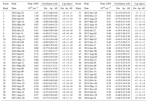 An example of an autumn case is the St. Patrick's Day event in March 2015 (Fig. 6, right panels). Although this was a major event reported in many studies, e.g., Clilverd et al. (2020), it ranks only at #24 in our Table 1 with an increase in NO by 0.59×1015 cm−2. Interestingly, in terms of simulated increase this event is quite similar in magnitude to the June 2015 event, which suggests that this was indeed a major event also from NO point of view.