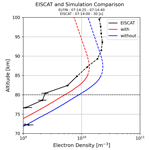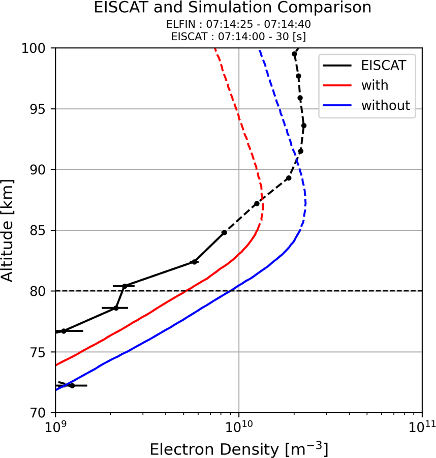 Figure 4Altitude profile of electron density. Simulation results, with/without the mirror force effect, are shown by the red/blue lines, respectively. The black line shows the EISCAT Tromsø radar observation. Note that it is inappropriate to compare simulation results with the observed data above 85 km altitude because there must be an electron density enhancement due to lower energy electrons than observed by the ELFIN satellite.