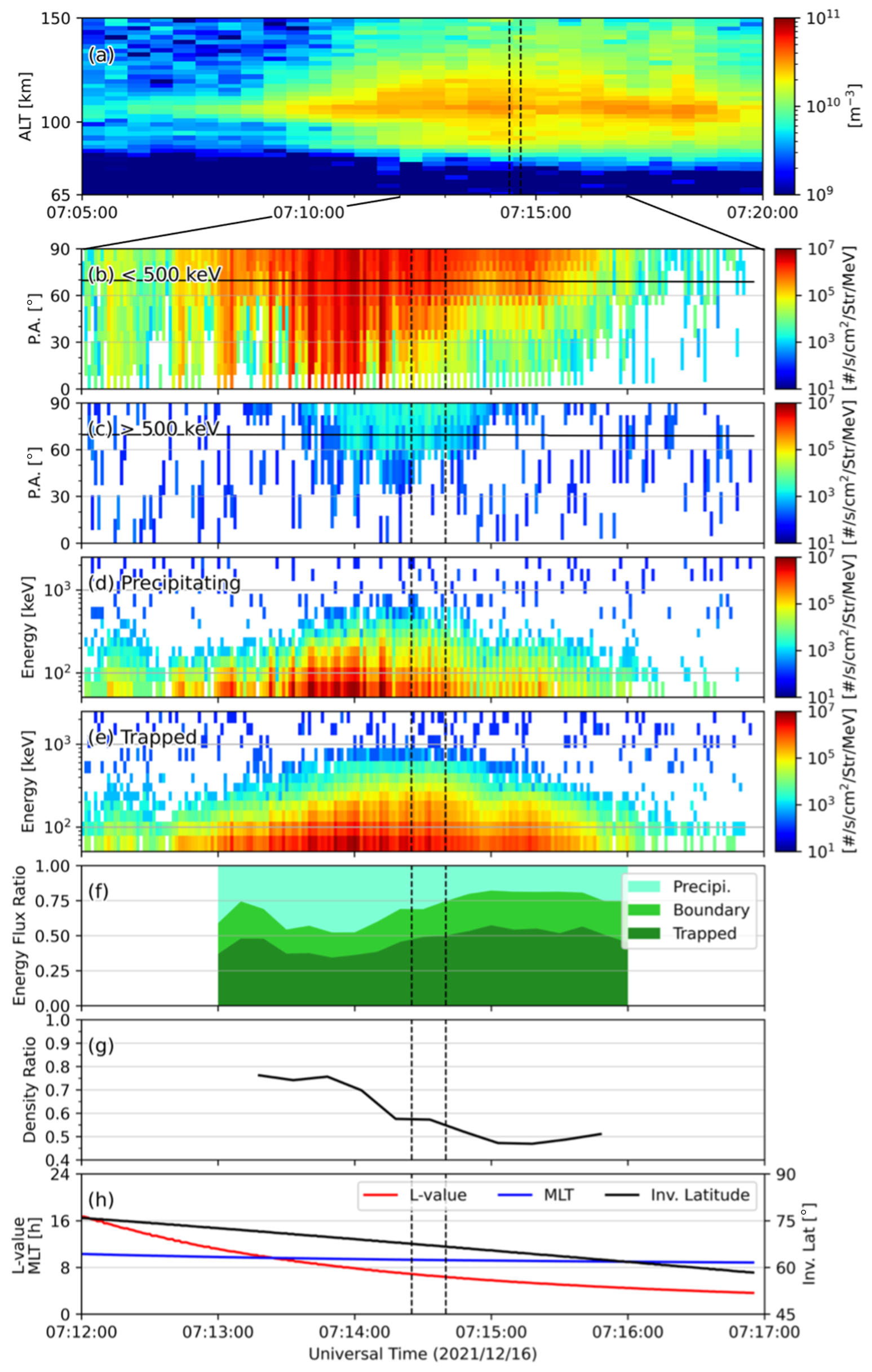 In this study, we also examined the latitudinal distribution of the density ratio for only one event (see Fig. 2g). We found that the difference due to the mirror force depends on latitude and that the ratio is more likely to be smaller as latitude decreases, even while electrons seemed to be precipitating from the radiation belt. This is because the distribution of electrons depends on latitude. Specifically, this is because the percentage of trapped electrons was more significant at lower latitudes. It is also statistically consistent with Qin's finding that the smaller the L value, the larger the ratio of energy flux of trapped electrons. However, the effects of the mirror force, i.e., the variations in density ratios due to distribution changes in both the energy and pitch angle, are not yet fully understood, so more ELFIN satellite observation events should be used to examine the latitudinal distribution of the ratio.