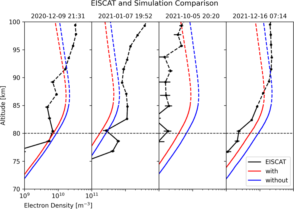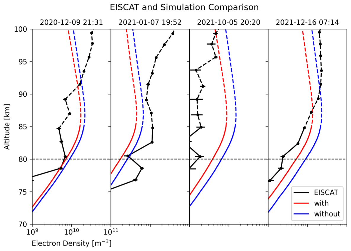 To compare the overall altitude profile of electron density, the simulation results and observational data showed good agreement for the 16 December 2021 event (see Sect. 3.2 and Fig. 5), but not clearly for the other events. One of the reason for unclear comparison results in Fig. 5 is assumed to be the low signal-to-noise ratio of the electron density profile observed by the EISCAT Tromsø radar. It is known that the signal-to-noise ratio becomes significantly low when the electron density is less than 1010 m−3, which has prevented accurate observation and comparison at an altitude of 80 km.