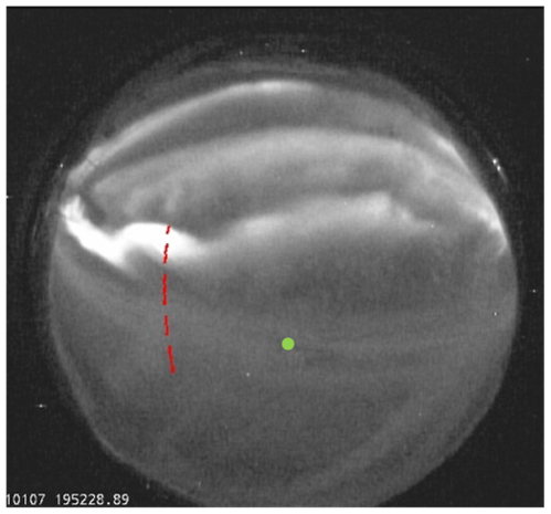 Figure 6Optical data collected by at Tromsø on 7 January 2021. The red dashed line is the satellite footprint, and the green dot indicates the radar beam point.