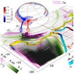 The downmapped variables are provided as input to the ionospheric model (Ganse et al., 2025), which gives the ionospheric conductances, horizontal currents and electrostatic potential Φ as output. As the ionosphere is modelled as a thin spherical shell, the height-integrated ionospheric horizontal current J is related to the conductance tensor Σ, the electric field E and electrostatic potential Φ by Also, from the current continuity condition, the divergence of the ionospheric horizontal current must be closed by the downmapped FAC as