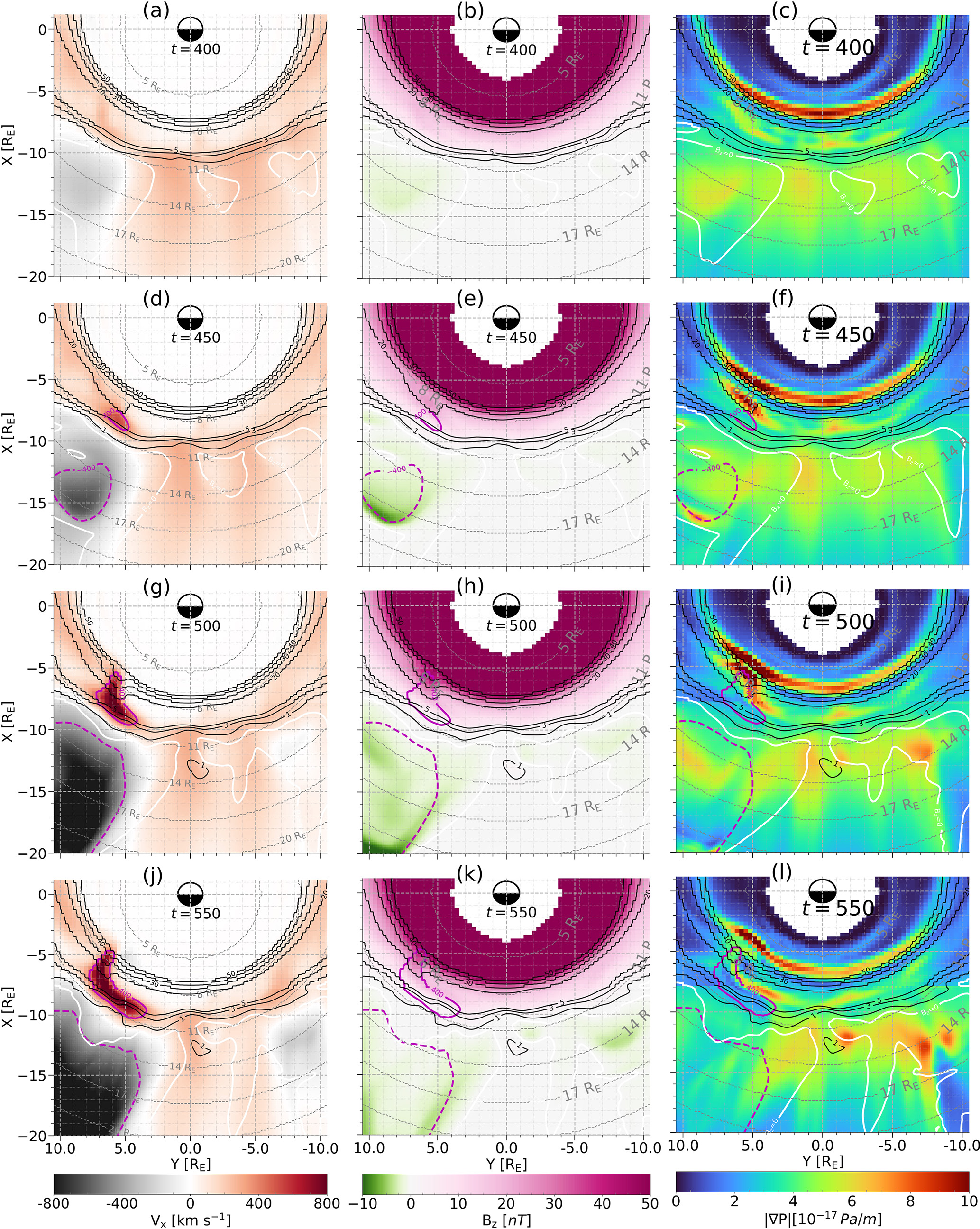 Figure 1g–i and j–l show the state of the plasma sheet at simulation times t=500 and t=550 s, respectively. During this time interval, the BBF structure grows in size, penetrates deeper towards Earth, drifts azimuthally duskward and slowly expands towards dawn (see Fig. 1g and j). It is also notable that the layer of pressure gradient enhancement associated with BBF is clearly present at 8 RE at t=500 s, and almost vanishes by t=550 s. Additionally, the white Bz=0 contours, which are the X-line proxy, shift tailward on the duskside. Overall, the evolution of the BBF reveals a dynamic interplay between the magnetic topology and the fast flow structures.