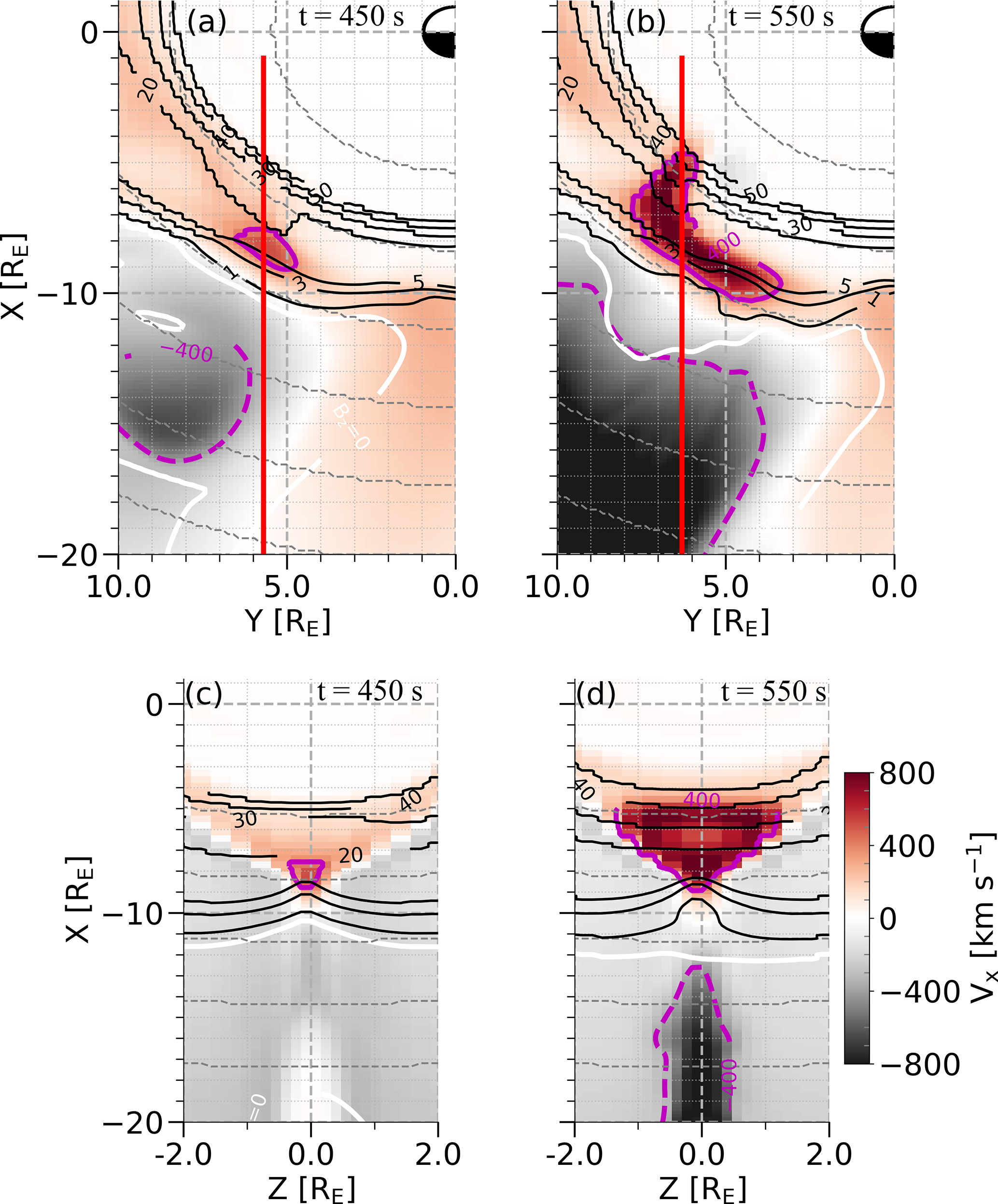 Figure 2 shows Vx in zoomed-in boxes centred around the BBF to evaluate its extent in the equatorial plane (Fig. 2a–b) and along the z-direction (Fig. 2c–d). The azimuthal scale of the BBF flow channel is approximately 2 RE at t=450 s, expanding to approximately 4 RE by t=550 s as it moves Earthward and drifts duskward. In contrast to the size in the xy plane, the size of the BBF structure in the xz plane changes from approximately 0.5 RE to 1.5 RE. This difference suggests that the fast-flow channels expand more in the azimuthal direction than in the off-equatorial plane direction.