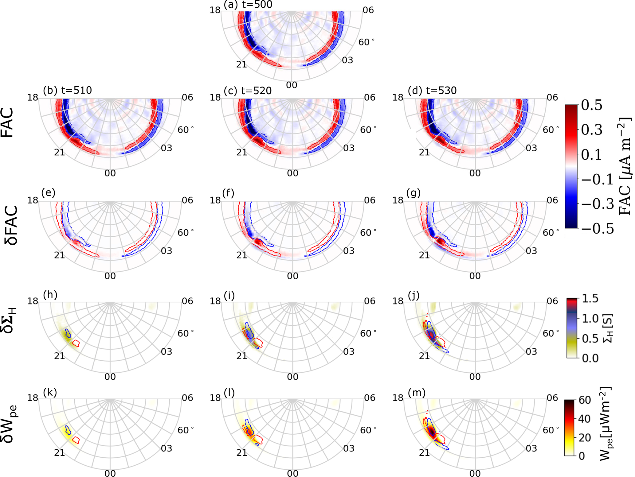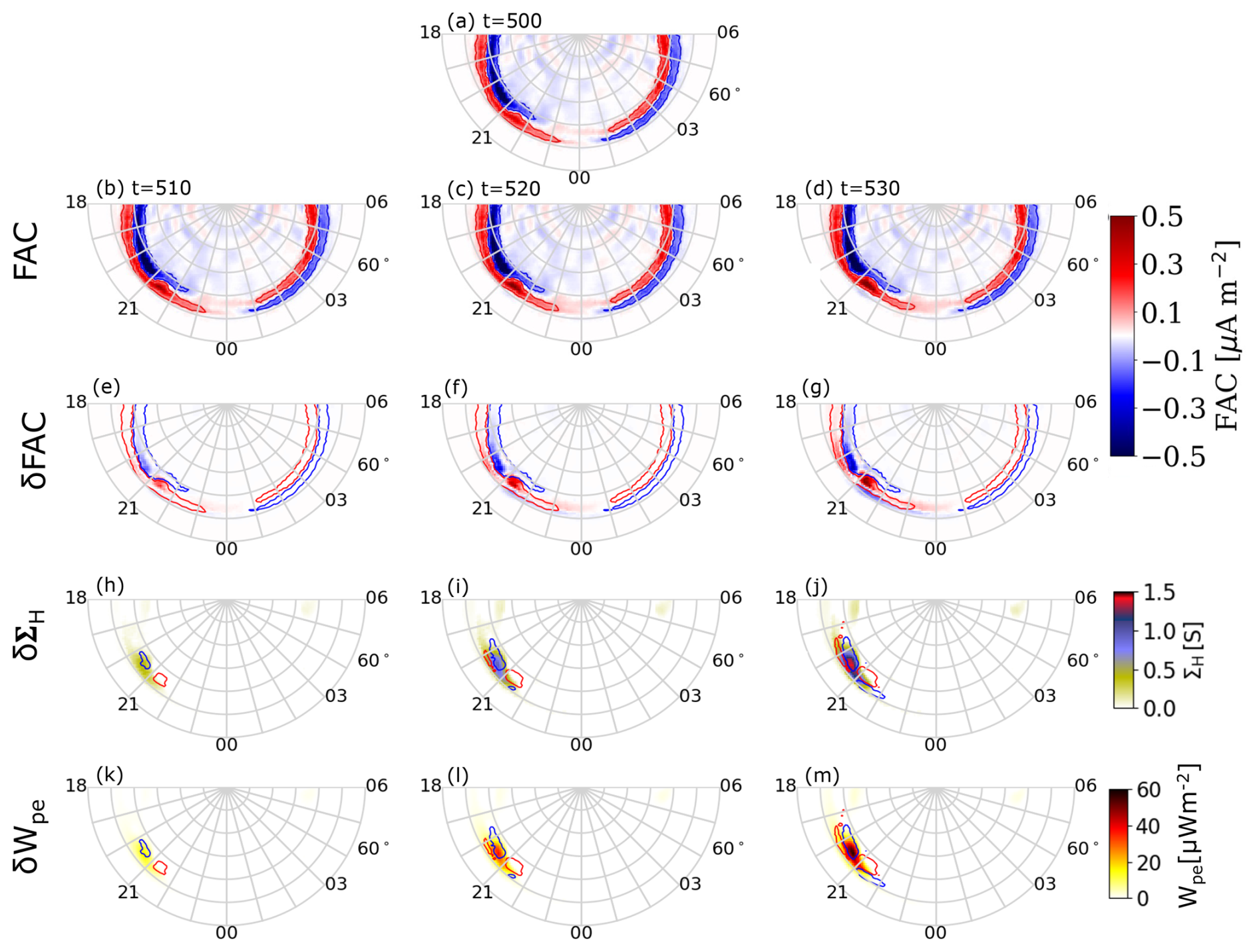 Figure 6Time evolution of BBF signatures. Panels (a)–(d) show the original FACs at t=500, 510, 520, and 530. Panels (e)–(g) present the residual FACs obtained by subtracting the FAC pattern at t=500 from the FACs in the second row. Panels (h)–(j) and (k)–(m), respectively, show the residual Hall conductances and precipitation energy fluxes obtained by subtracting the values at t=500 s from the values at t=510, 520, and 530 in the same order as FACs.
