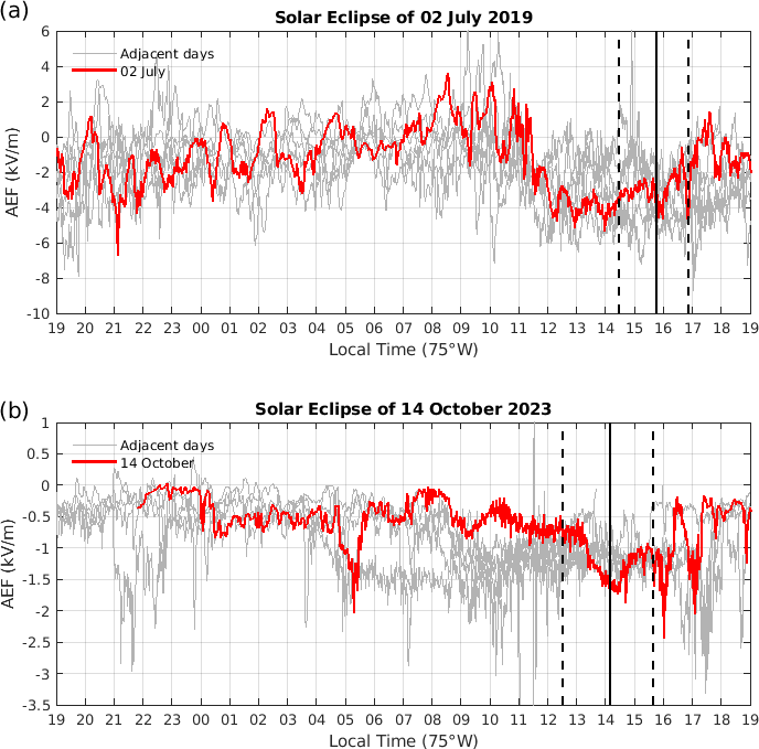 Figure 2Atmospheric electric field measurements during the day of the solar eclipse and the surrounding days. (a) 2 July 2019 and (b) 14 October 2023 solar eclipses. Maximum obscuration (vertical black continuous line), eclipse onset and eclipse end (vertical black dashed line) are indicated.