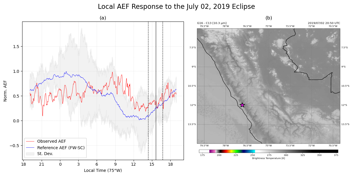 Figure 3(a) Fair Weather curve for atmospheric electric field measurements during the day of the solar eclipse on 2 July 2019 according to statistical criteria (FW-SC). Maxima obscuration (continuous vertical black line), eclipse onset and eclipse end (dashed vertical black lines) are also indicated. (b) GOES-16 map at 10.3 µm. The magenta star shows the location of the sensor.