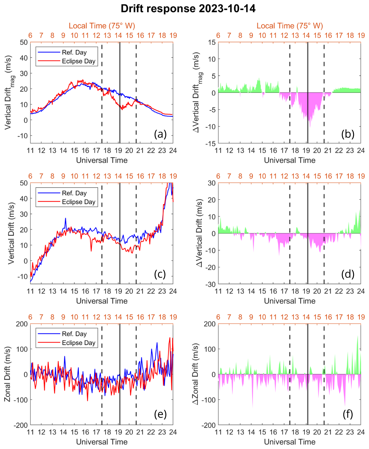 Each eclipse event presents a distinct response. For the 2019 eclipse, a positive effect on the vertical drift is observed (Fig. 5b and d), while for the 2023 eclipse, the effect is negative (Fig. 6b and d). Particularly for the 2019 eclipse, a very slight increase in the vertical drift deduced from magnetometers is observed (Fig. 5b), while the measured vertical drift is very significant during and after the eclipse (Fig. 5d). For the 2023 eclipse, the decrease is similar for both vertical drifts (Fig. 6b and d), except that the measured one presents a phase shift with respect to maximum obscuration. In both cases, the change in zonal drift is less evident or very unclear.