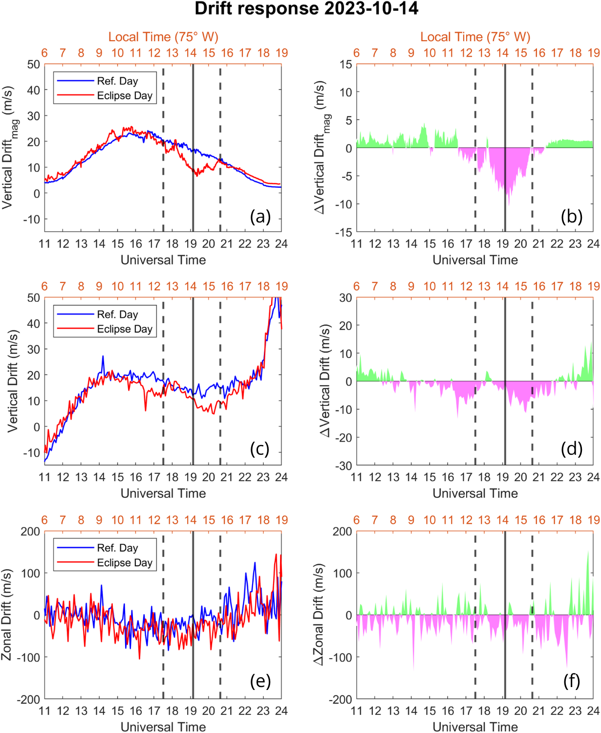 Figure 6Vertical drift E×B values (left) during the solar eclipse on 14 October 2023 and control day (12 October 2023). Differences between the eclipse day and the reference (right) are shown, where positive values are coloured green and negative values in magenta. Maximum obscuration (vertical black continuous line), eclipse onset and eclipse end (vertical black dashed line) are indicated.