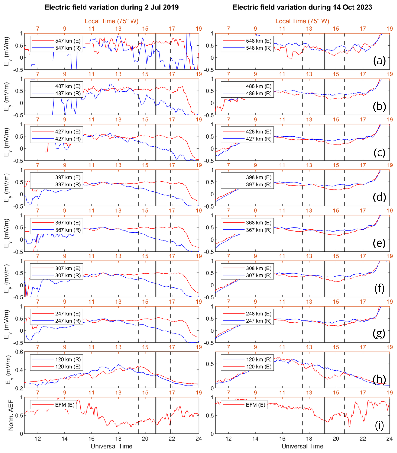 Figure 7 shows the zonal component of the electric field (positive eastwards) derived from the measured drifts of the Jicamarca ISR (2019, left) and the JULIA-MP radar (2023, right), as well as that derived from magnetometers at 120 km and normalized AEF (using Tacza et al., 2018, technique). A 5-point moving mean was applied to every time series. For the 2019 case, a decrease near the maximum obscuration time is observed at ground level and at 120 km (row h and i), followed by an increase. This behavior is consistent with the photoionization dependence at lower altitudes in the ionosphere. However, higher altitudes show no decrease, which is consistent with the predominance of transport processes over solar dependence for this event (Bravo et al., 2020; Jonah et al., 2020). On the other hand, the 2023 case shows a much clearer behavior with a decrease at all altitudes, with a quicker response at lower altitudes, which is consistent with the solar radiation dependence as the main ionization source below 200 km.