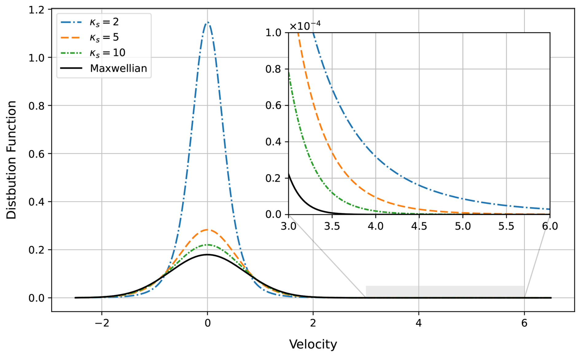 Figure 1A schematic comparison between modified Kappa velocity distributions for κs values 2, 5, and 10, and the Maxwellian velocity distribution.