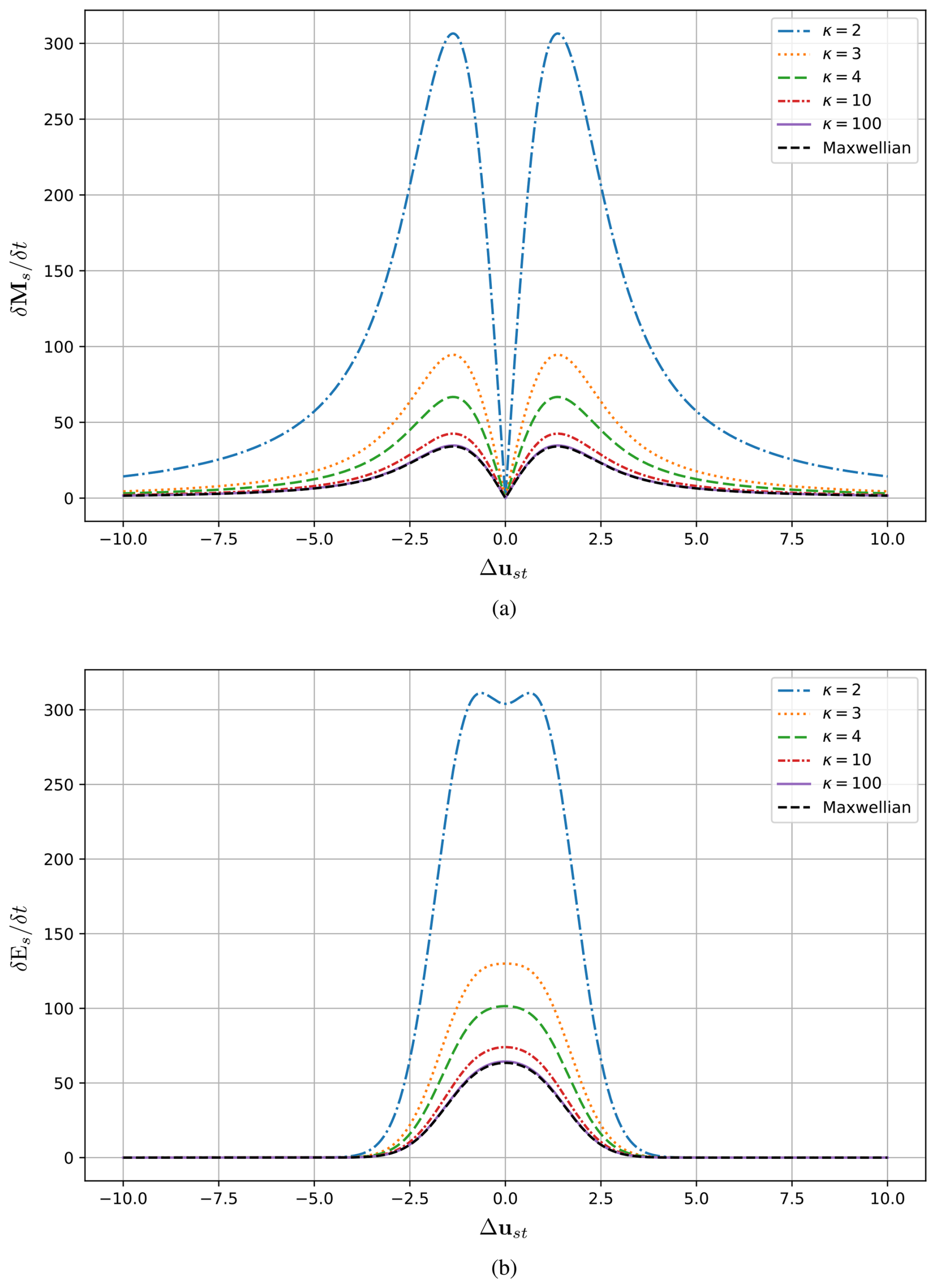 Within the framework of the five-moment approximation of the transport equations, the effective collision frequency and the thermalisation rate can be obtained directly from the momentum and energy collision terms. As derived in the previous section for the modified Kappa distribution, Eqs. (47) and (48) present the effective collision frequency and the thermalisation rate, which are essential for understanding the exchange of momentum and energy between particles due to collisions. The effective collision frequency reflects the average rate of how frequently collisions occur, determining the efficiency of momentum transfer within the system, while the thermalisation rate measures how rapidly the system approaches thermal equilibrium through collisions. Equations (47) and (48) show that the modified Kappa distribution affects the effective collision frequency and the thermalisation rate through the kappa dependent term D(κs,κt). This factor depends explicitly on the kappa parameters κs and κt of the interacting species s and t, and its form changes depending on the type of collisions under consideration. To compare the effective collision frequency and thermalisation rate of the modified Kappa and Maxwellian distributions, we must first understand how their particle velocity distributions differ. While the Maxwellian distribution has most particles concentrated around the distribution core, with low and intermediate velocity magnitudes, the modified Kappa distribution shifts this balance by increasing the number of particles both in the low-energy core and in the high-energy tails, (i.e., at low and high velocity magnitudes), as shown in Fig. 1. This redistribution in the particle velocities is directly related to the effective collision frequency and the thermalisation rate. In collision processes, such as Maxwell molecule collisions, where the collision frequency does not depend on particle velocity, the redistribution has no effect. The effective collision frequency and thermalisation rate remain the same even when modified Kappa distribution is used. This is confirmed by the result D=1, which shows that the kappa parameter does not change either the effective collision frequency or the thermalisation rate compared with the Maxwellian case,