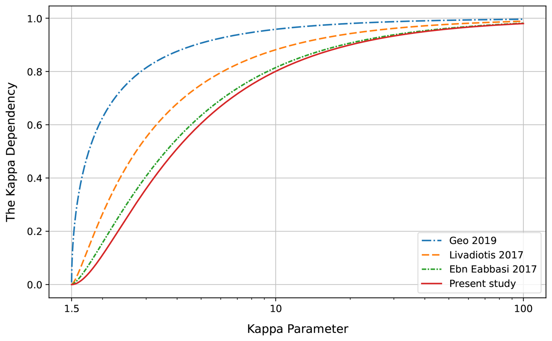 All studies show a different dependence on the κ parameter, but they still exhibit the same behavior: at low values of κ, the electrical conductivity becomes smaller compared to the Maxwellian case, and as κ increases, we approach the Maxwellian case but never exceed it. This confirms that plasmas with larger κ values are better conductors. Thus, deviations from the Maxwellian limit lead to a decrease in electrical conductivity. Figure 7 also shows that, the curves converge to the present work. This can be explained through the collision models used in the derivation of the transport coefficients. In each study, a more general collision term model was used. For example, Guo and Du (2019) used the Linearized Lorentz Collision Model with a relaxation-time approximation for electron-ion collisions. Livadiotis (2017) used the Fokker–Planck collision operator with simplifications related to the direction of the electric field. Finally, the work of Ebne Abbasi et al. (2017) used the Fokker–Planck collision operator, where the derivation was generalized, and the only approximation occurred in the last step for the hypergeometric function. The work of Ebne Abbasi et al. (2017) is the closest to our present study, as can be seen clearly in the figure. The reason is that, in our study, we used the full Boltzmann collision integral, of which the Fokker–Planck operator can be considered an approximation.