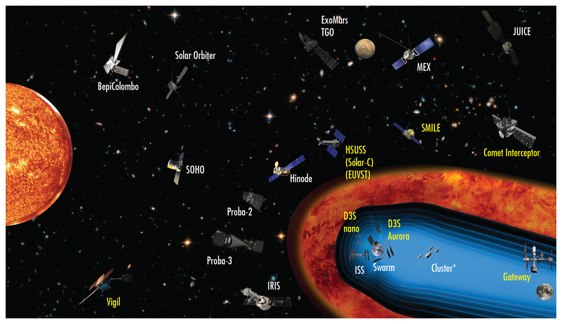 Driven by and in support of the European science community, the ESA has built a solid portfolio of Heliophysics missions. Missions that are of interest for Heliophysics commmunity such as Ulysses, SoHO, Cluster, Double Star, Solar Orbiter, Cassini-Huygens, Venus Express, Mars Express, Rosetta, BepiColombo, and Jupiter Icy Moons Explorer (Juice), are a result of and the responsibility of the Science Directorate (D/SCI). However, in recent years, other ESA directorates have also developed and launched missions that address Heliophysics science. These include the Directorate of Earth Observation (D/EOP) with Swarm and other Earth Explorer missions (including the Earth Explorer 10 candidate, Daedalus, and follow-on activities carried out by the ESA-NASA Lower Thermosphere-Ionosphere Science Working Group (ENLoTIS, Berthelier et al. (2024)) and Soil Moisture and Ocean Salinity mission (SMOS). The Directorate of Operations (D/OPS) has developed the Vigil mission, the Distributed Space Weather Sensor System (D3S) (e.g nanosatellites and the Aurora mission), and the Space Weather Service Network. The Directorate of Human and Robotic Exploration (D/HRE) has developed and supported many payloads, both for the International Space Station and for the Lunar Gateway and Lunar surface, and the Directorate of Technology, Engineering, and Quality (D/TEC) has expertise in developing instrumentation and models for measuring and simulating environments throughout the heliosphere. The latter directorate is also responsible for the Proba-2 and Proba-3 missions, with support from D/SCI. The fleet of ESA related recent and upcoming mission that allow us to study the various topics of heliophysics are illustrated in Fig. 2.