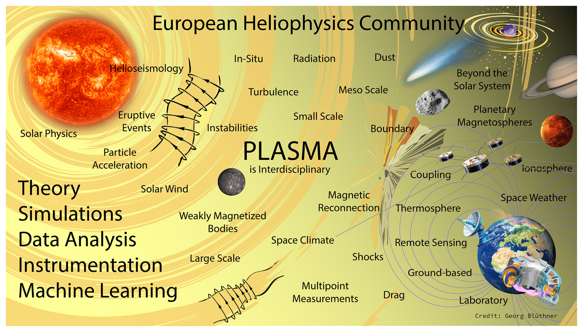 Heliophysics spans a wide range of disciplines covering the study of the Sun, its sphere of influence, and the different bodies in the Solar System and their interactions with the Sun. The field also covers a staggering wide range of scales, from the outer edge of the Solar System to mesoscales, and down to the smallest (kinetic) scales at which electron dynamics determine plasma behaviour. Heliophysics is therefore inherently interdisciplinary, encompassing aspects of solar physics, space plasma physics, ionosphere-thermosphere physics, magnetospheric physics, planetary physics, small body physics, fundamental and applied space weather research, and more. Common to all these disciplines is the physics of (fully and partially) ionised plasmas, ranging from collisional to collisionless, and from magnetic to plasma energy dominated, see Fig. 1.