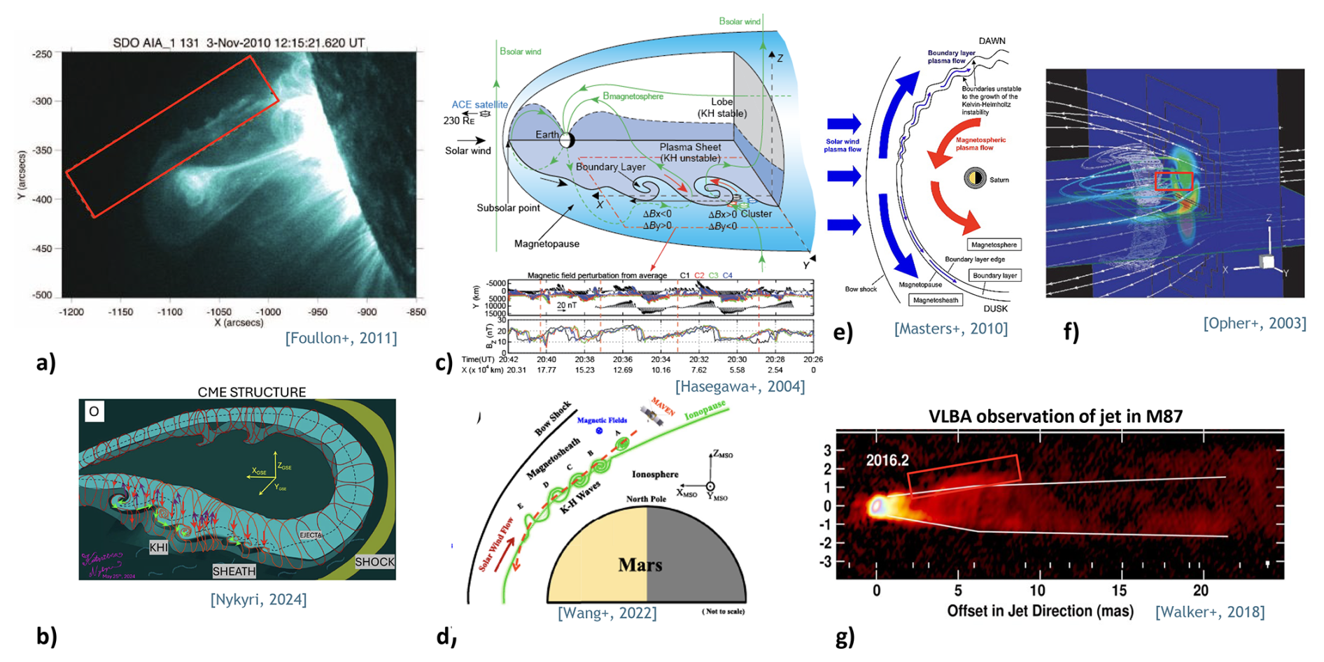An example of such plasma processes (shown in Fig. 5) is the different studies of the Kelvin–Helmholtz instability in various contexts: (a) near the Sun (Foullon et al., 2011); (b) in the solar wind at the boundary of a CME (Nykyri, 2024); (c) at the flank of the Earth's magnetopause (Hasegawa et al., 2004); (d) at the Mars dawnside ionopause (Wang et al., 2022); (e) at the Saturn dawnside magnetopause (Masters et al., 2010) (f) near the heliopause (Opher et al., 2003), and (g) at the edge of galactic jets (Walker et al., 2018). By comparing and contrasting these plasma processes, we can study how plasma flows interact with different obstacles throughout the Solar System and in an astrophysical context.