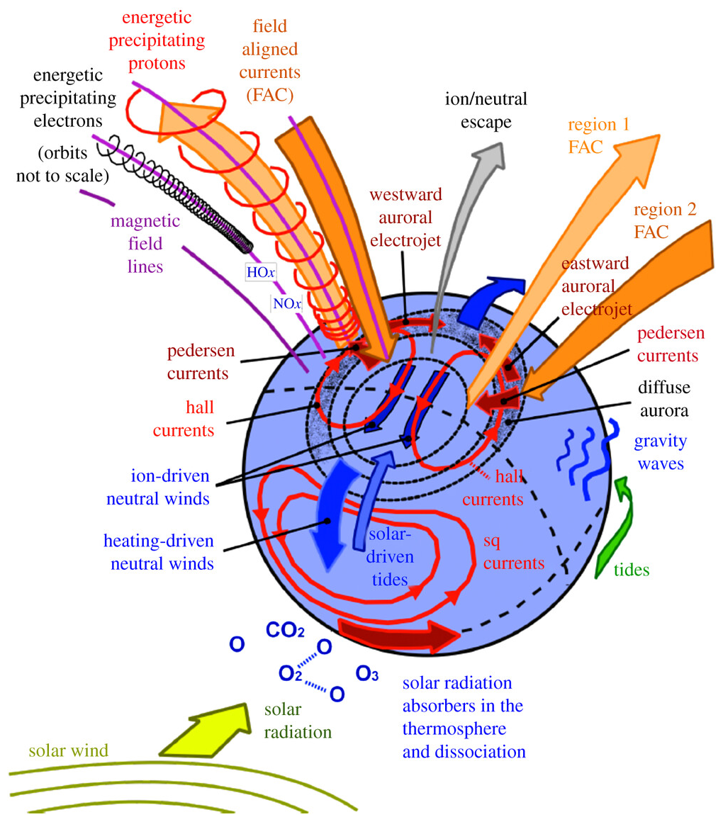 An additional degree of complexity arises from the coupling with the solar wind and magnetosphere at high latitudes. This coupling is responsible for the main deposition of energy in the system through ionospheric currents and particle precipitation, which also cause the aurora. Excitation by solar illumination and thermospheric winds at the equator generates the equatorial electrojet and fountain. Such electrodynamic couplings are also observed on other planets, but they can differ greatly due to factors such as rapid planetary rotation, the presence or absence of an intrinsic magnetic field, and the density of the atmosphere. This is where past, present and future space exploration missions, combined with detailed physical models, can be crucial in enabling in-depth comparative planetology.