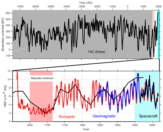 Figure 8Reconstructions of solar activity from a range of sources, including direct spacecraft measurements, ground-based magnetometers, sunspot observers, and radionuclide information in tree rings and ice sheets. Reprinted from Owens et al. (2018);