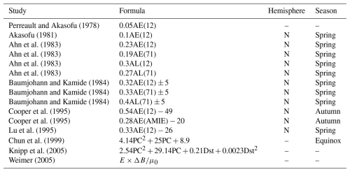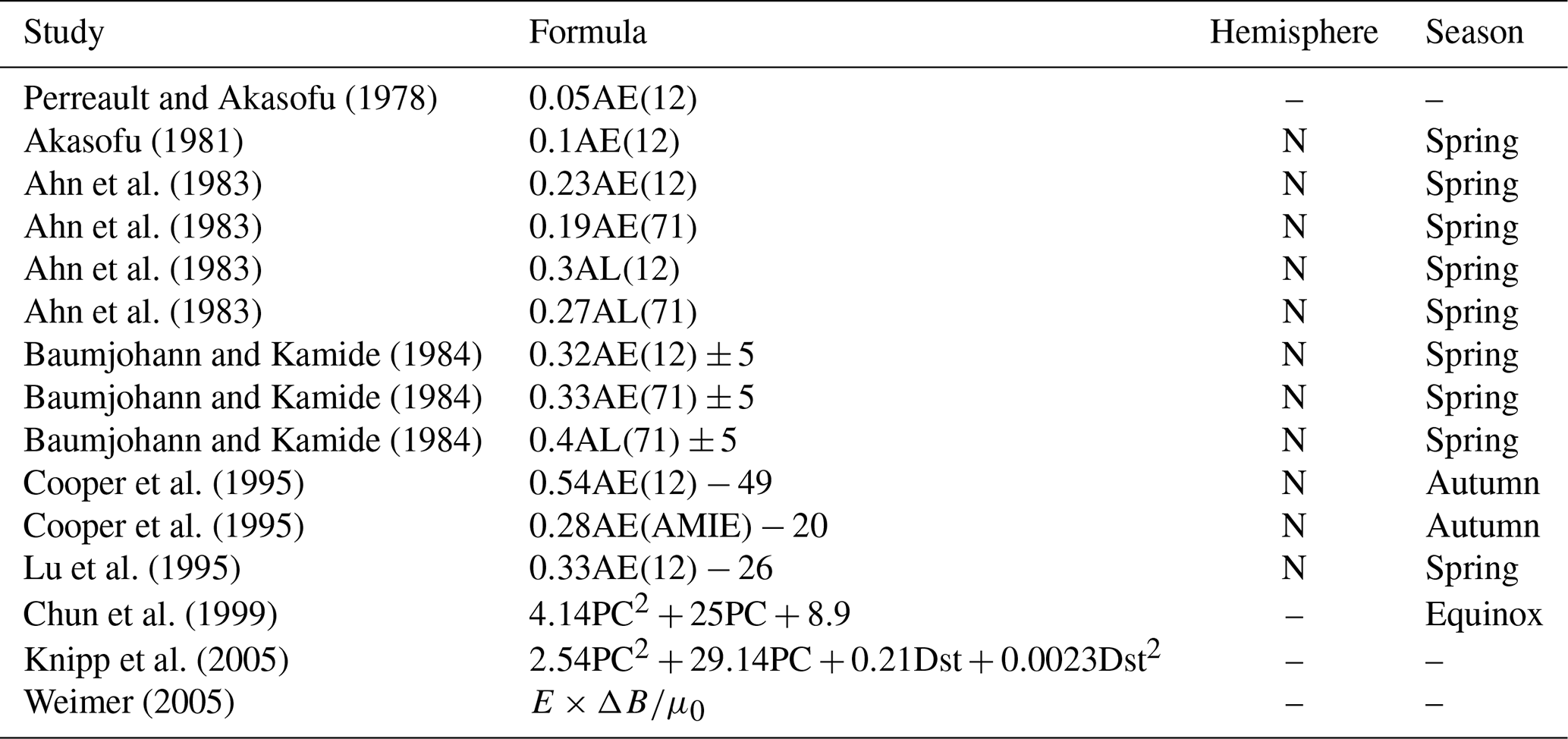 Further to the calculation of Joule heating rates in GITM and TIE-GCM, ionospheric dissipation through Joule heating is commonly approximated via empirical formulations that use geomagnetic indices as input. Several studies have derived empirical relationships for the quantification of hemispheric and global Joule heating that are using the AE or AL indices as inputs; these include the studies by Perreault and Akasofu (1978), Akasofu (1981), Ahn et al. (1983), Baumjohann and Kamide (1984), Cooper et al. (1995), Lu et al. (1995). Later on, Chun et al. (1999) estimated Joule heating with a quadratic fit to the Polar Cap (PC) index. Expanding upon the work of Chun et al. (1999), Knipp et al. (2005) proposed an empirical formula based on the PC and the Disturbance Storm Time (Dst) indices. Moreover, Weimer (2005) proposed another method to estimate Joule heating; it is noted that in the study of Weimer (2005) Joule heating and Poynting flux are used interchangeably. A summary of the above studies and the corresponding relationships as well as constraints in terms of season or hemisphere where these are applicable are presented in Table 1.