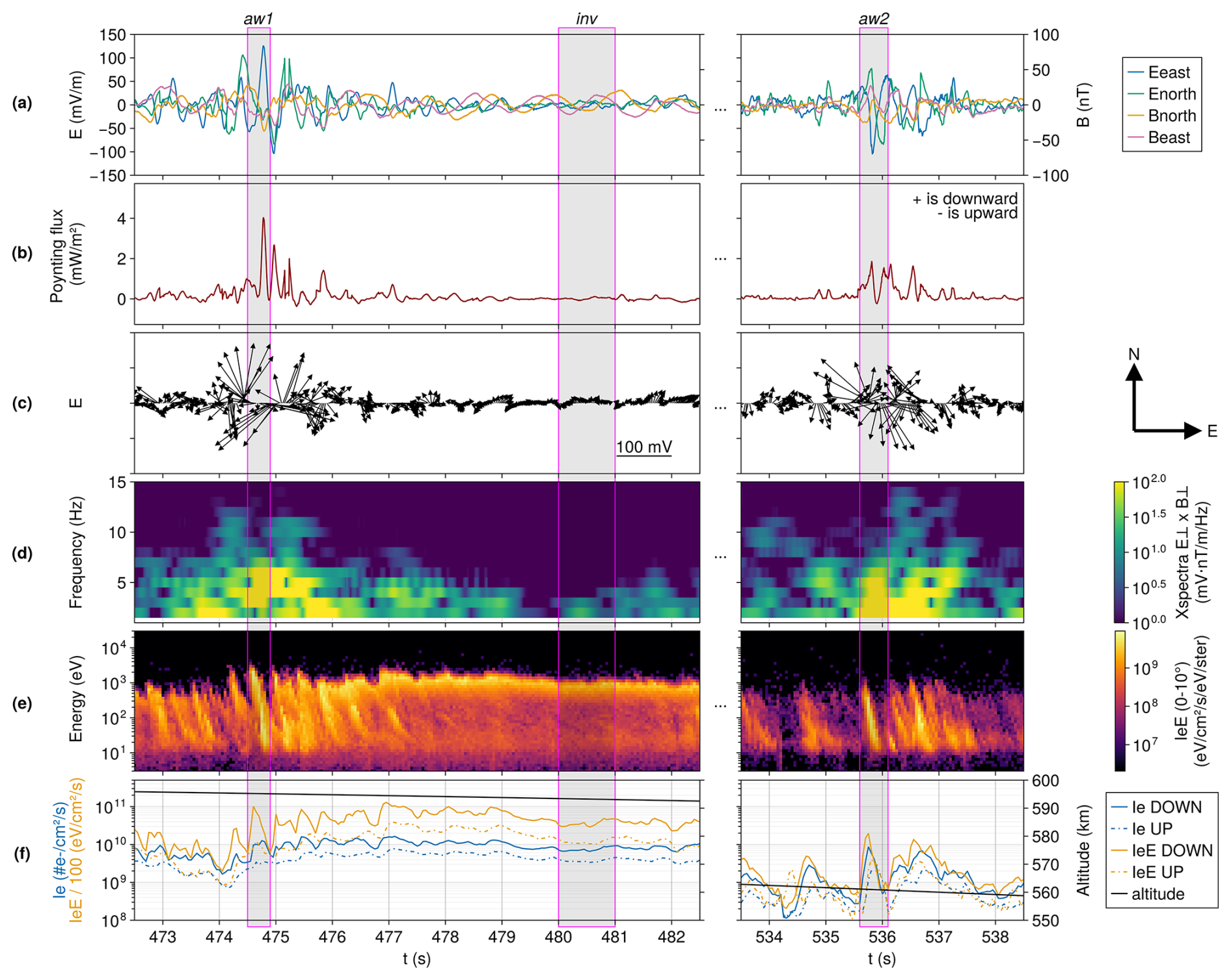 Figure 1Rocket measurements for two time intervals. (a) Northward and eastward components components of the electric and magnetic fields. The DC components have been filtered out. (b) Field-aligned Poynting flux, with positive values corresponding to a downward flux into the ionosphere. (c) Perpendicular electric field vectors. Each arrow is one measurement in time, but not all measurements are shown to reduce cluttering. Positive y-direction corresponds to the north, and positive x-direction corresponds to the east. (d) Cross-power between the perpendicular electric and magnetic fields. (e) Precipitating electron energy flux with a pitch-angle between 0 and 10° (approximately field-aligned). (f) Field-aligned incoming (yellow) and outgoing (blue) total electron energy flux (dashed lines) and total electron number flux (full lines), as well as the altitude of the rocket. The grey boxes with magenta borders and with the names aw1, aw2 and inv highlight the precipitation events used in this study.