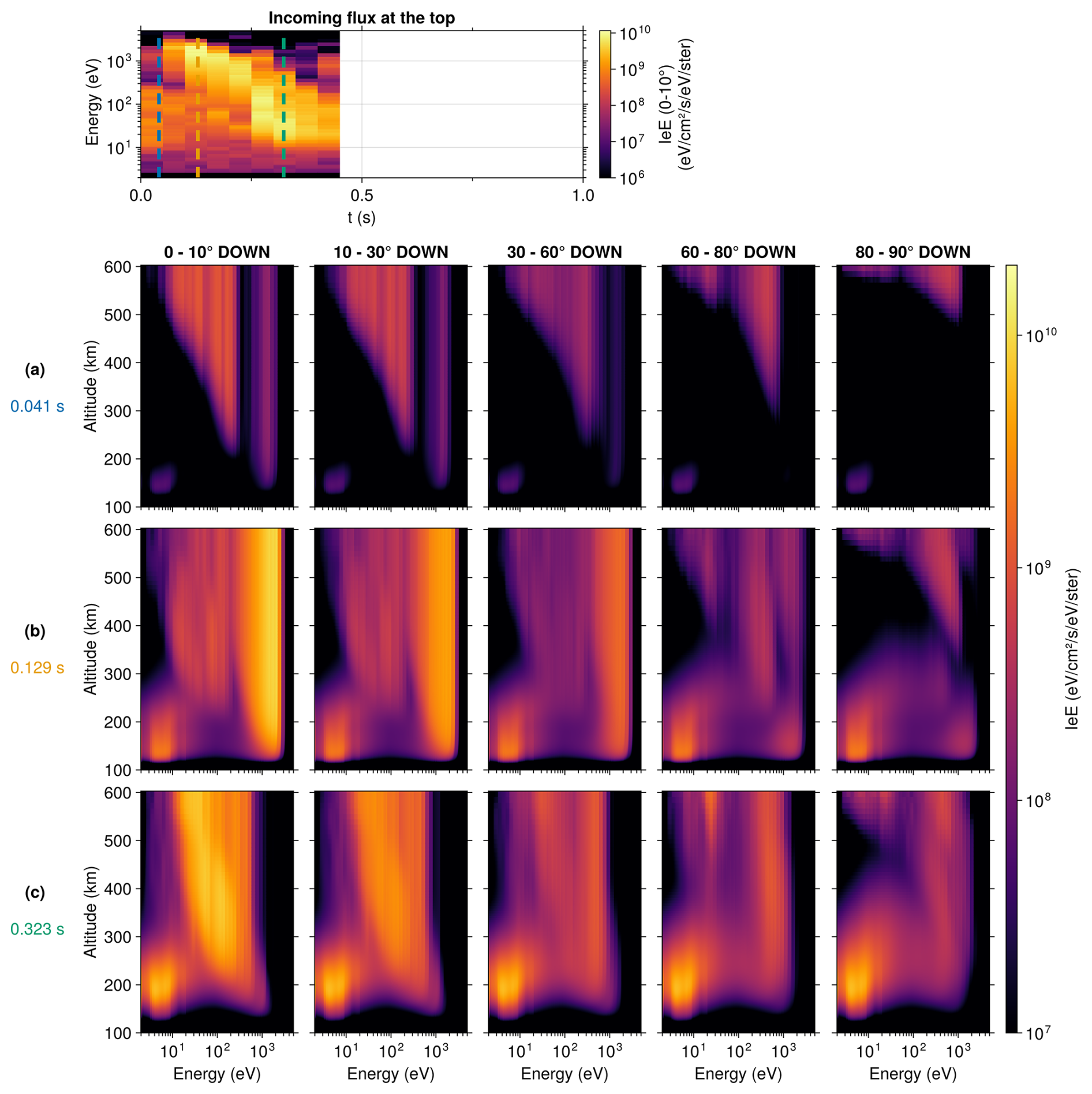 Figure 2The top panel presents the downward electron energy flux of the aw1 event used as input. Vertical dashed lines correspond to the times selected for the rest of the figure. Rows (a), (b) and (c) show snapshots of the electron energy flux IeE calculated by the transport code at 0.041, 0.129 and 0.323 s after the start of the precipitation/simulation, respectively. The different columns correspond to different pitch-angle streams.