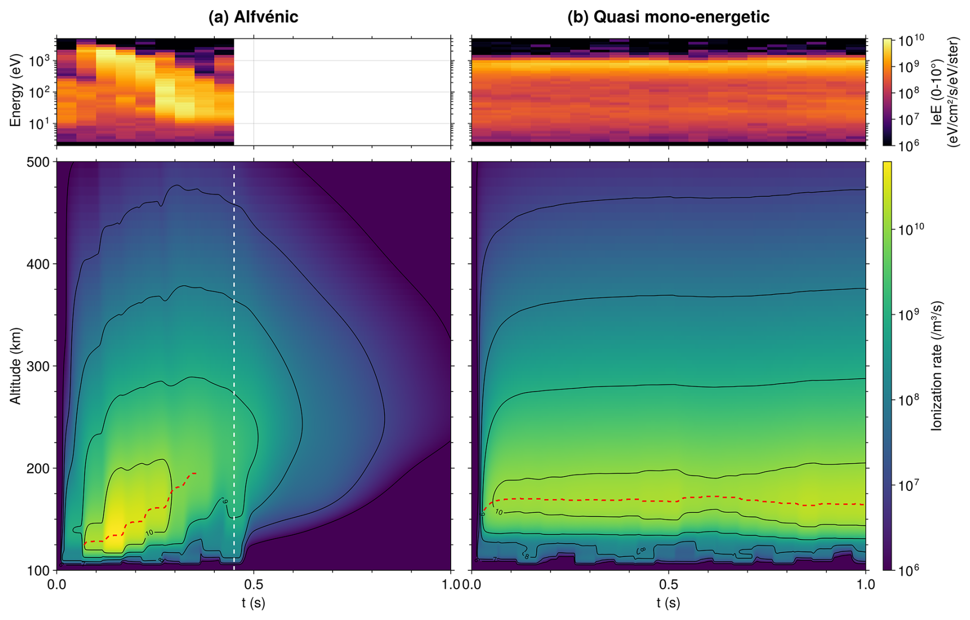 Figure 3Ionization rates in time and height as calculated by the transport code. The top panels show the precipitation used as input. The bottom panels show the calculated ionization rate profiles. (a) Using the dispersed structure in precipitation from the aw1 event as input. The vertical dashed line in the bottom panel indicates the time at which the precipitation stops. (b) Using the quasi mono-energetic precipitation from the inv event as input. For both event, the red dashed line indicate the height of maximum ionization rate, as long as the value is greater than 10 % of the maximum ionization rate value for the whole event.