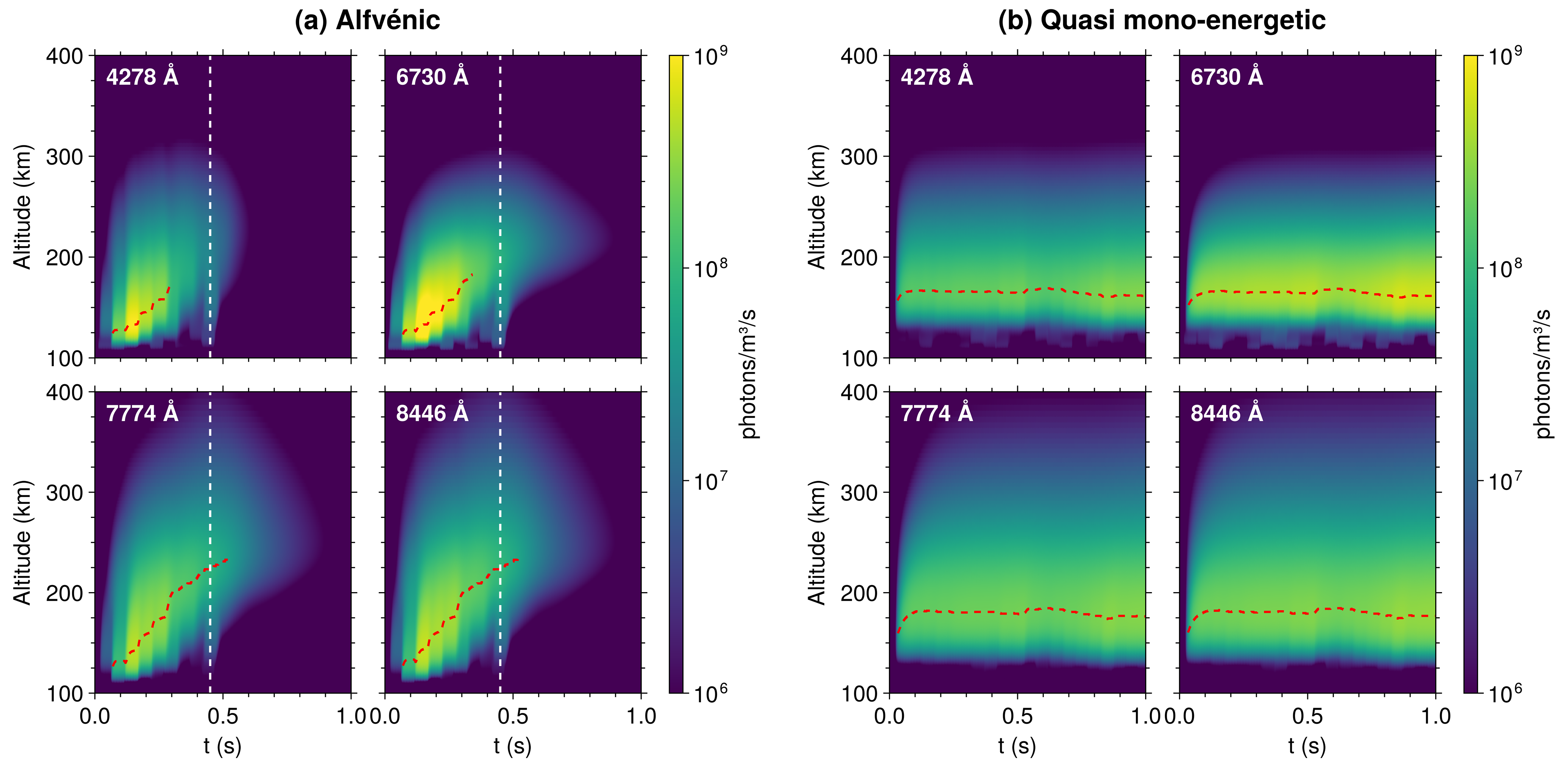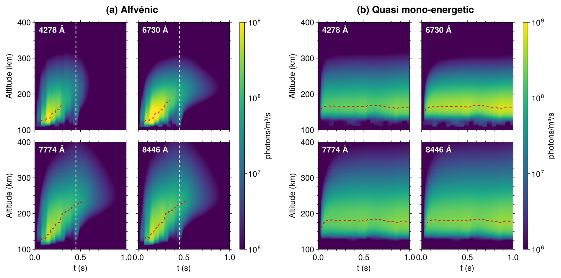 For comparison we also modeled the quasi mono-energetic precipitation event inv observed a few seconds after the dispersed structure aw1 (see Fig. 1) and with a similar precipitating energy flux. Variations in the maximum intensity (Fig. 4) are perceptible, but the height of the peak intensity is stable over time. This is different from the dispersed structure aw1 described above which deposits its energy over a wider range of altitudes. Furthermore, the column integrated optical emission were observed to be relatively stable in time for quasi mono-energetic precipitation, with the wavelengths 6730 and 8446 Å dominating, while for Alfvénic precipitation, a peak at 6730 and 4278 Å was first observed followed by a rapid decay of these wavelengths. The modeled intensity variations could be used in future optical studies to help characterize the precipitation spectra. An in-depth quantitative analysis of the differences between the different precipitation types is left for future work. Such a study could be combined with a comparison with high-resolution optical measurements.