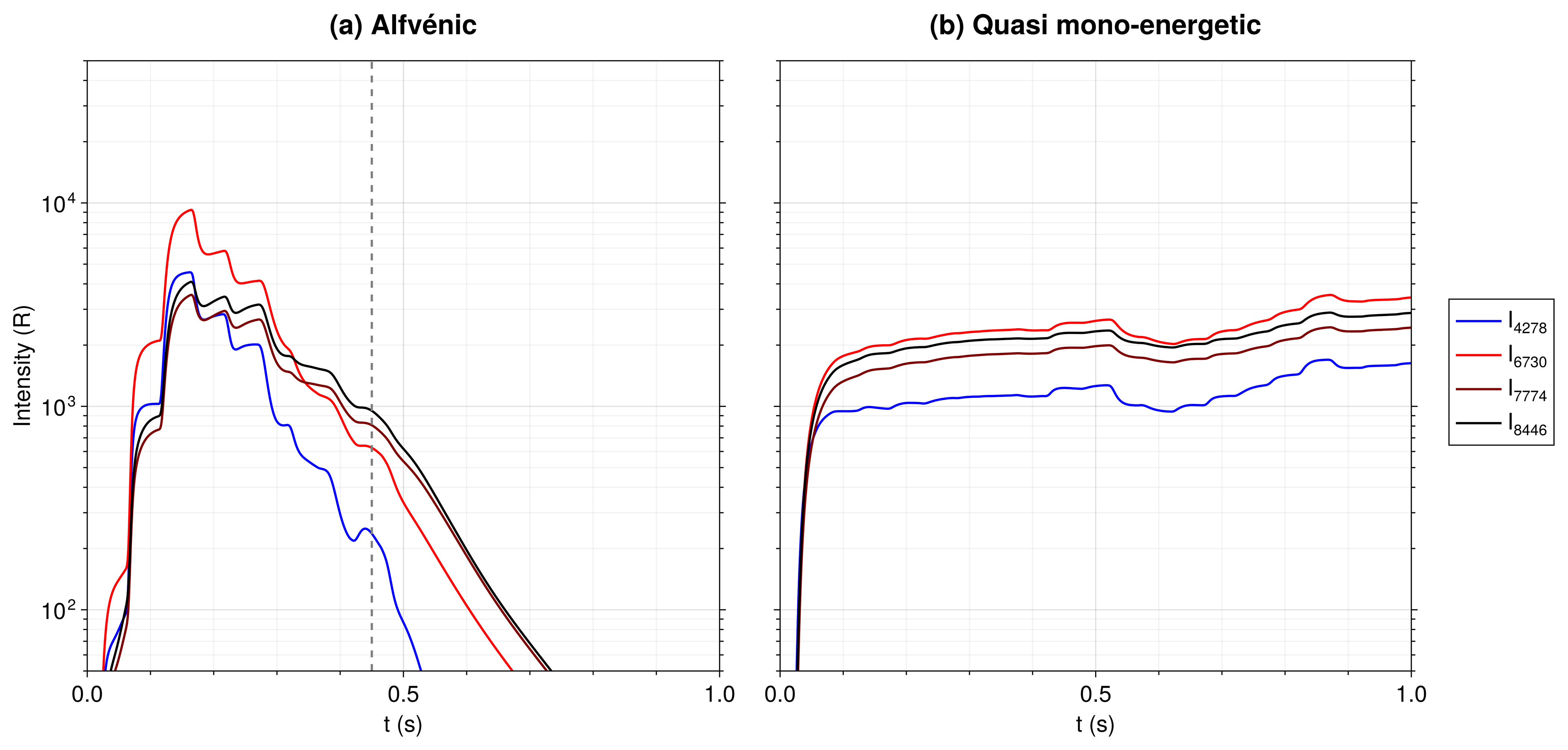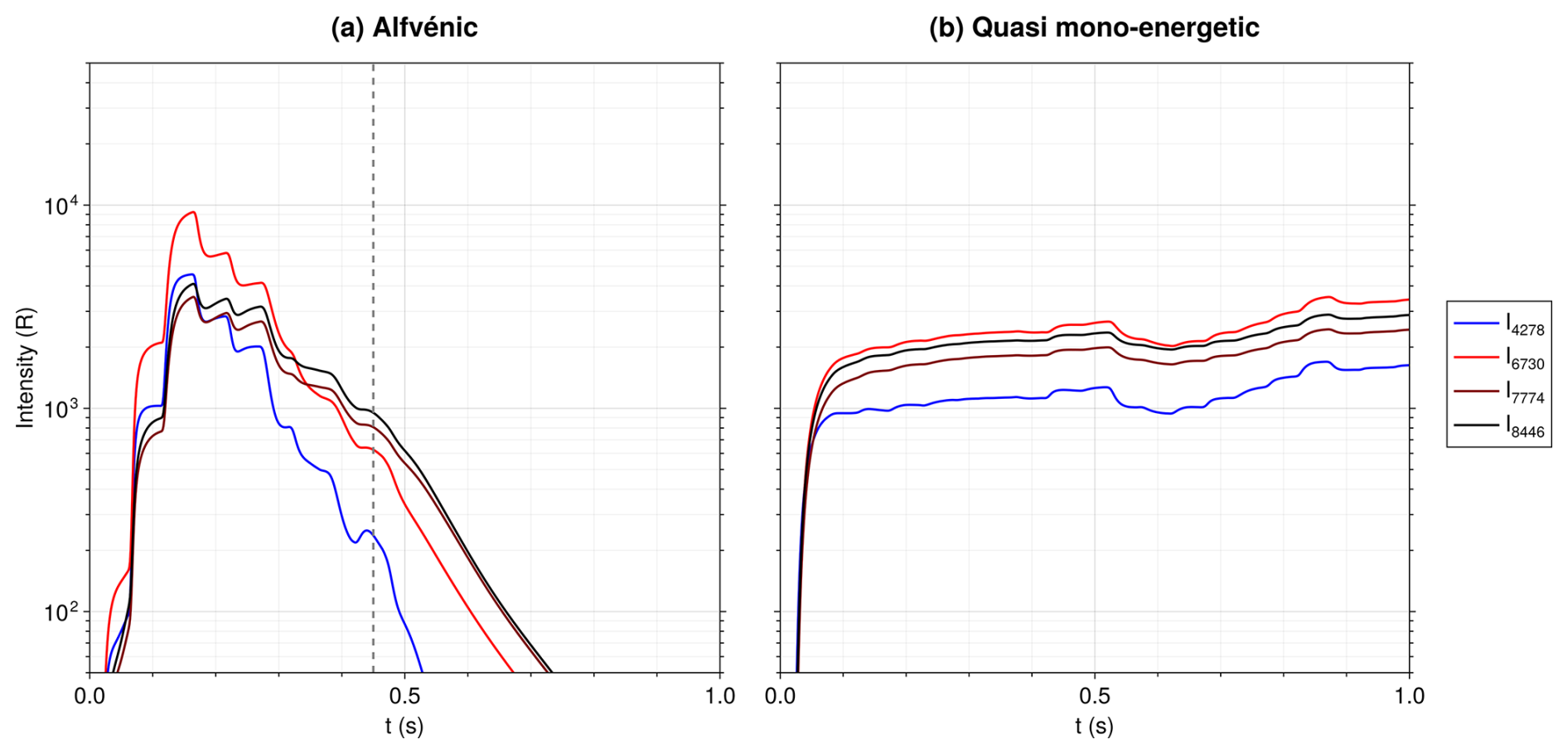 Integrating these optical emissions rates in height while taking into account the tiny delays due to the finite speed of light, one can calculate the expected optical intensity that would be seen on the ground. This is done and shown in Fig. 5. The differences between the precipitations of the aw1 and inv events are clearly visible here. The column-integrated optical intensities produced by the Alfvénic precipitation of event aw1 present a clear peak at the beginning followed by a steady decrease in time, while the optical intensities produced by the steady precipitation of the inv event are very stable. Furthermore, there are differences in which wavelengths are dominant. For the quasi mono-energetic case, the intensity order is stable in time from 0.075 s after the start of the precipitation. The order from the brightest to the faintest is . For the Alfvénic precipitation, I6730 dominates at the peak, with I4278 having the second highest intensity. After the peak, both decrease faster than I8446 and I7774, which start to dominate after 0.35 s.