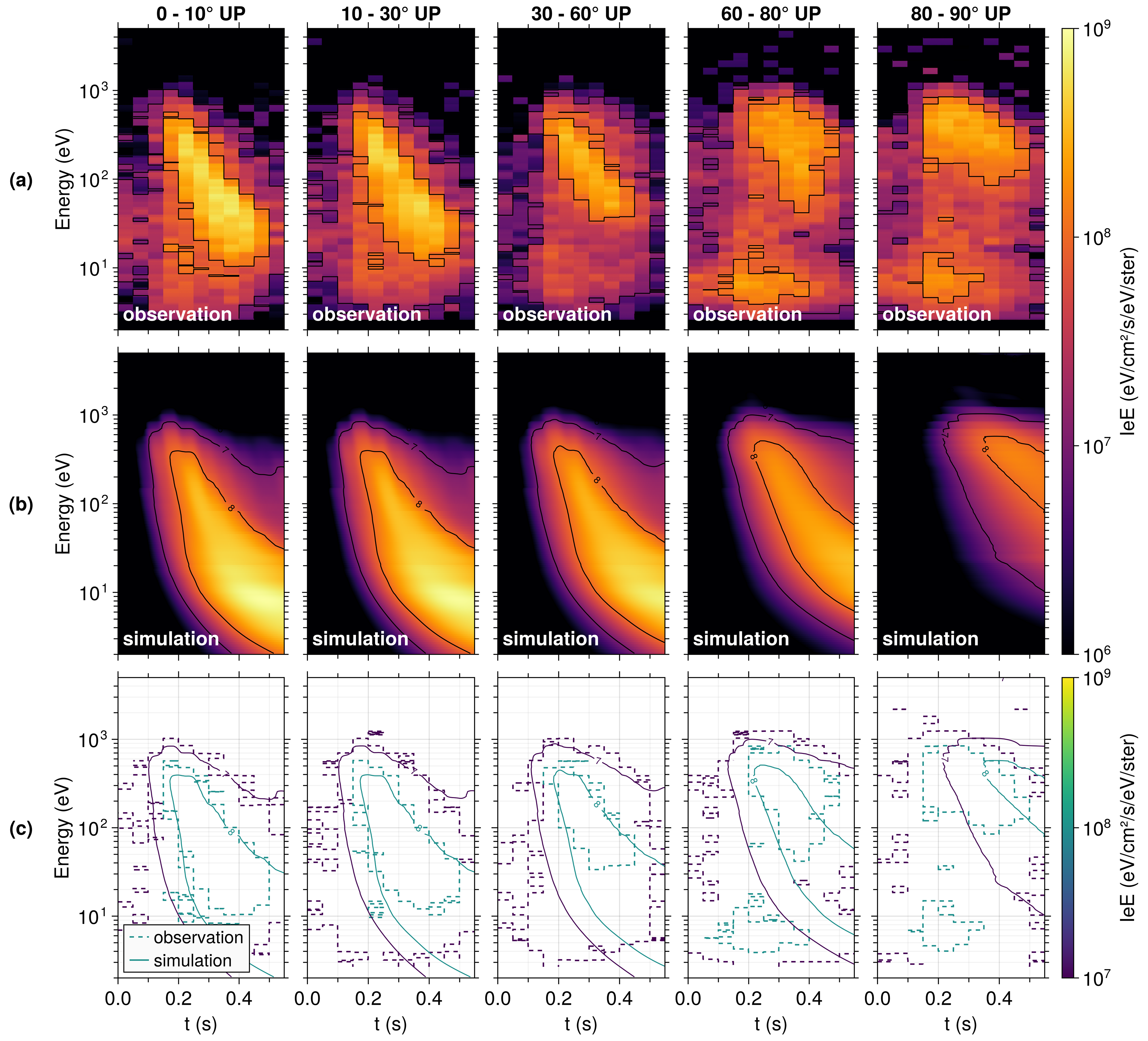 The upward flux of the aw2 event measured by the rocket are shown in Fig. 6a. Different panels correspond to different pitch-angle streams. Previously in this article, we described the upward electron flux has having pitch-angles from 90 to 180°, where 180° corresponds to field-aligned up. For easier identification, the pitch-angles in Fig. 6 are given from 0 to 90° with a suffix “UP”, where 0° corresponds to field aligned up. The upward flux modeled at the rocket altitude when using the downward flux of event aw2 as input are shown in Fig. 6b. For better vizualisation, Fig. 6c, shows the contours of the colormaps from Fig. 6a and b superimposed. Comparing the measured and modeled upward flux, a few minor discrepancies can be identified:
