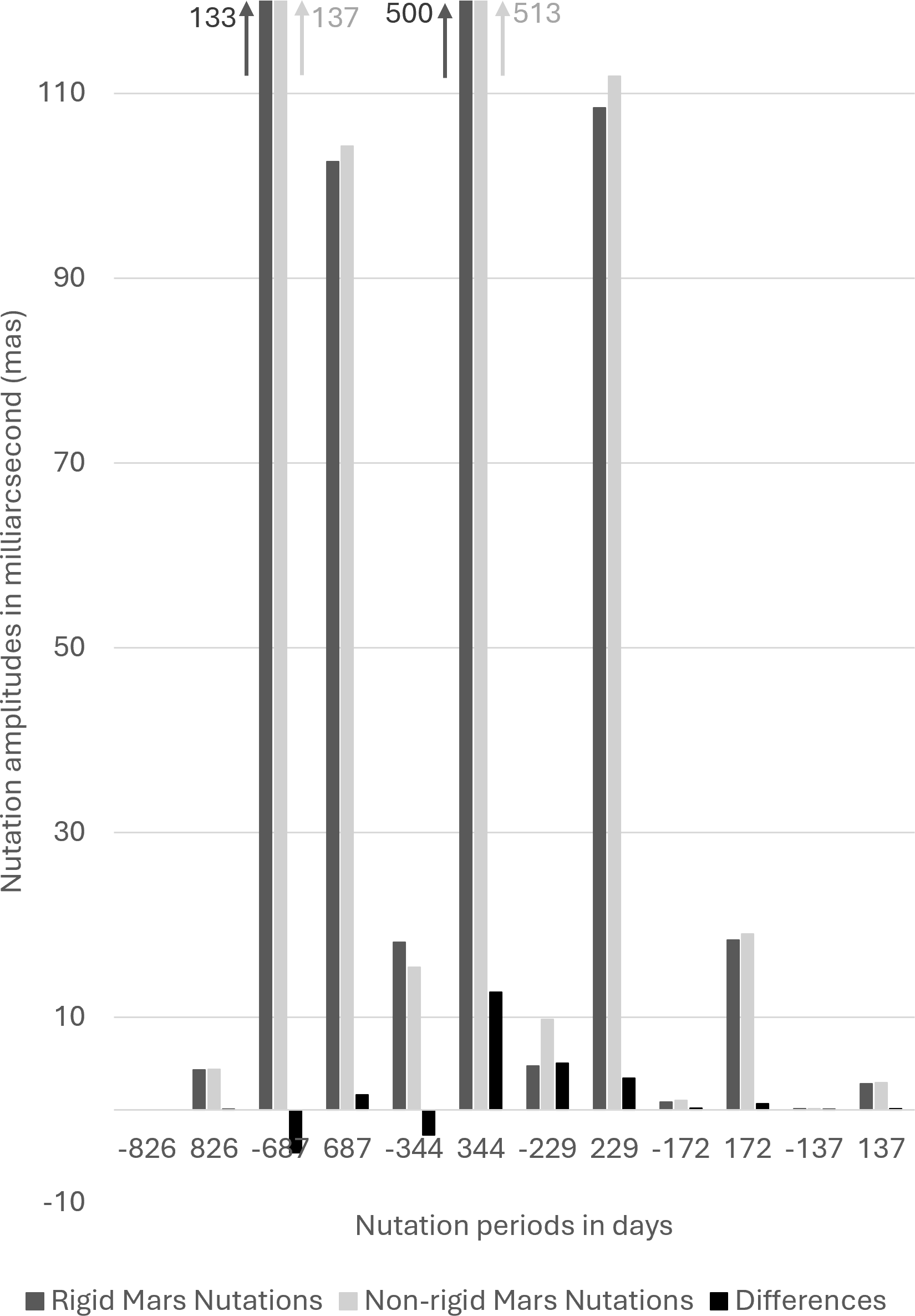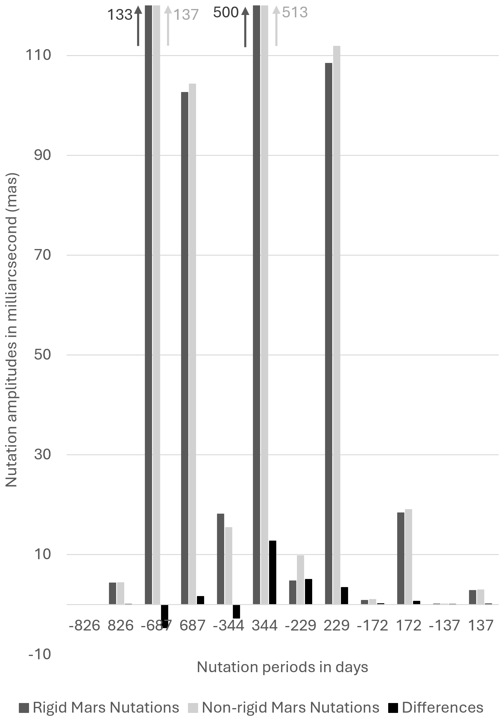 Figure 1Amplitudes of the main nutations of Mars. Note that the two largest ones have their amplitudes truncated for the sake of visualization. Negative periods correspond to retrograde nutations and positive, to prograde nutations.