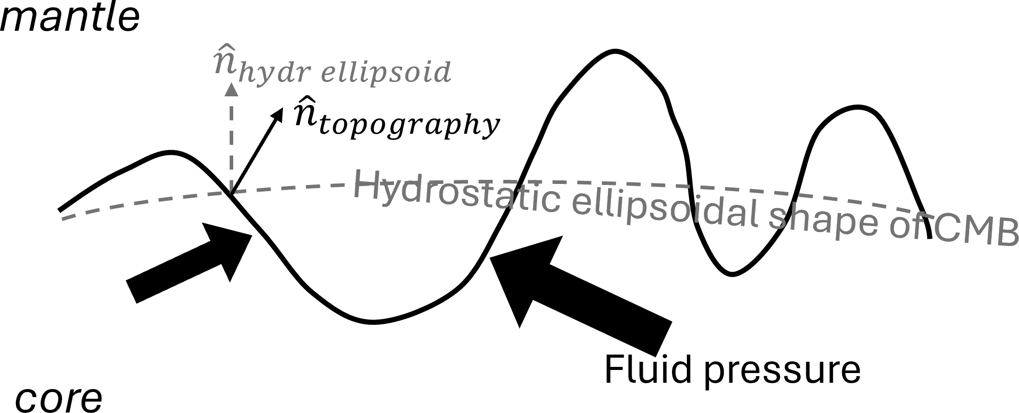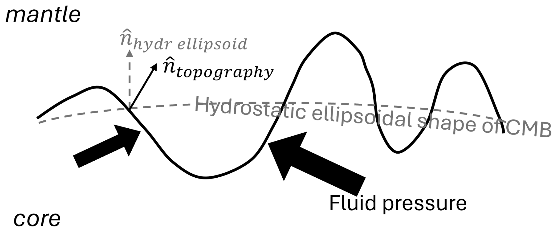 Figure 2Representation of the pressure torque acting on the core-mantle boundary, where n^topography is the normal to the topography and n^hydr ellipsoid is the normal to the hydrostatic ellipsoid corresponding to the CMB.