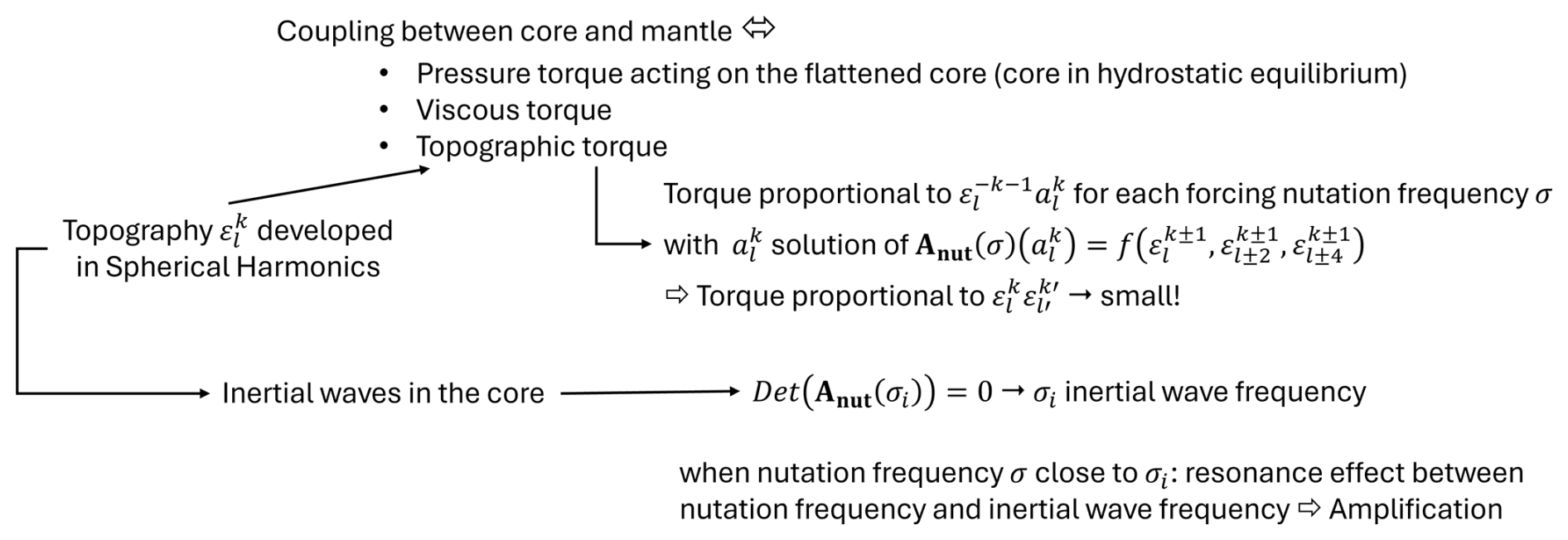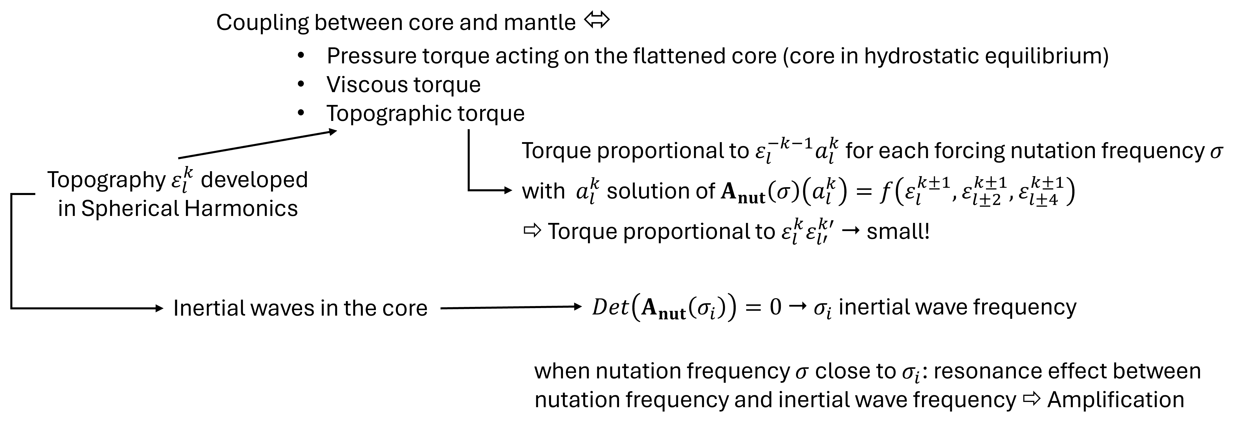 For comparison, in the case of Earth, nutation observations as well as variations in the length of day (LOD) provide valuable constraints on the deep interior, and in particular on coupling mechanisms at the core–mantle boundary (CMB). For nutations, following an approach similar to that of Koot et al. (2010), we recently re-evaluated the coupling constants at both the CMB and the inner core boundary. The revised values allow for additional coupling mechanisms beyond viscous and electromagnetic coupling. The incorporation of updated atmospheric and oceanic corrections to the nutation data has led to the determination of a larger CMB coupling constant than that reported by Koot et al., thereby leaving more room for non-hydrostatic or topographic coupling (Cheng et al., 2026). In addition, the electromagnetic coupling strength estimated by Mathews et al. (2002; see also Buffet et al., 2002) is likely overestimated, since the skin depth of magnetic diffusion at diurnal timescales is smaller than the thickness of any plausible electrically conducting layer at the base of the mantle and the lower mantle conductivity might even be smaller than that of the core. Although turbulence could enhance the effective viscosity, it is unlikely to increase it by several orders of magnitude (Shih et al., 2023). Consequently, topographic coupling remains a viable mechanism to account for the observed nutation. However, as shown for the Earth (Puica et al., 2023; Dehant et al., 2025), the pressure torque acting on the CMB is proportional to the product of topography coefficients εlkεlk when the topography is expressed in spherical harmonics and normalized by the core radius. It is therefore of second order in the topography, which additionally decreases with increasing degree of the spherical harmonics (Kaula's law, see Puica et al., 2023). The pressure torque can therefore be expected to be much smaller than the pressure torque associated with the hydrostatic flattening of the core (ε20hydrostatic), in particular for high spherical harmonic degrees l, as the topography amplitude decreases with increasing degree. Nevertheless, the expression of the torque involves functions of inertial wave frequencies, which can lead to resonance effects when the tidal forcing frequency approaches the inertial wave frequency. These inertial waves, governed by the restoring effect of the Coriolis force, have periods of the order of weekly, diurnal, or sub-diurnal cycles and experience limited damping. As a result, they are strong candidates for influencing nutations and short-period variations in LOD, provided a resonance effect occurs. This consideration has motivated us to analyse these cases through a spherical harmonic expansion of the topography up to degree 24, beyond which the topography amplitude becomes too small to affect observations, even near resonance.