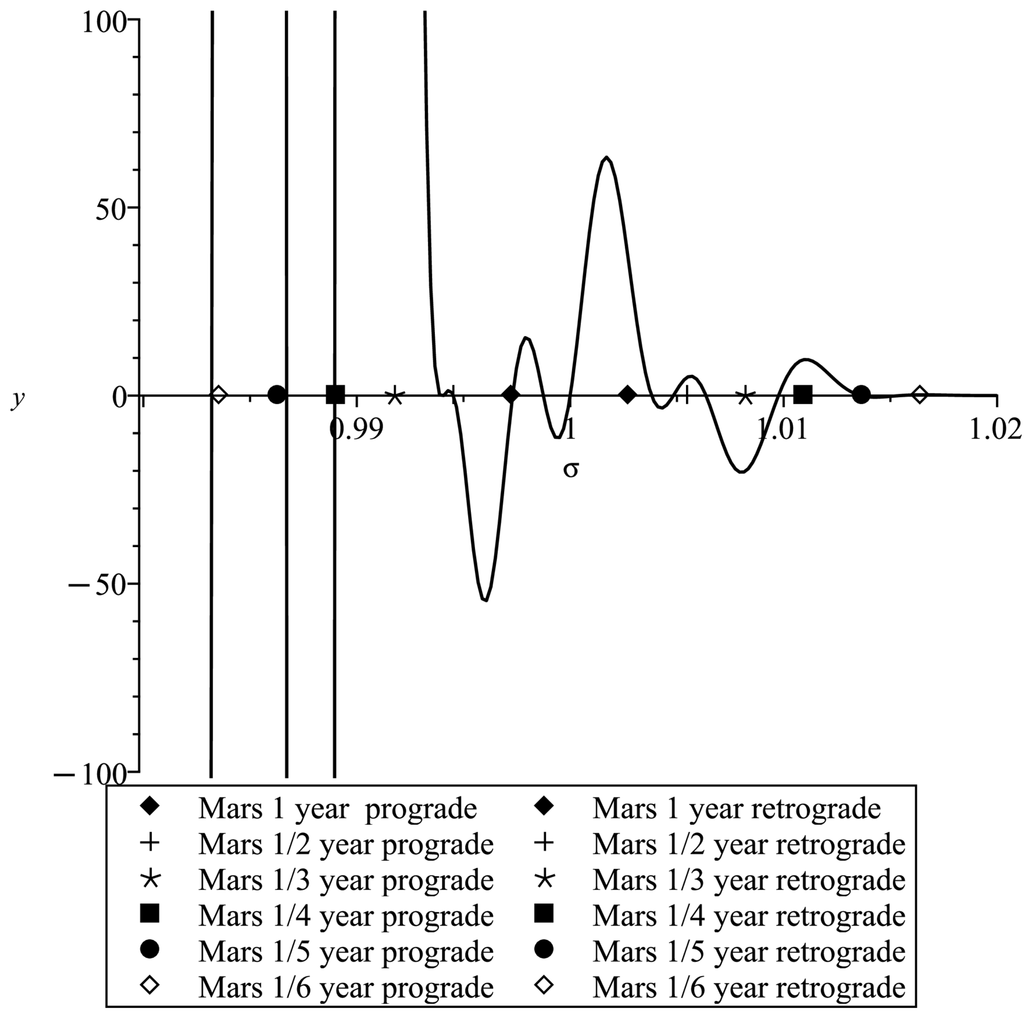Figure 4Determinant of the matrix Anut involved in the system of Eqs. (14), showing the resonances where the curve is crossing zero. The x axis represents the frequencies in cycles d−1 in a frame tied to the planet. The nutation periods in that frame are shown in the diurnal frequency band with the symbols expressed in the legend on the left-hand side of 1 cycles d−1 for prograde nutations and on the right-hand-side of 1 cycles d−1 for the retrograde nutations.