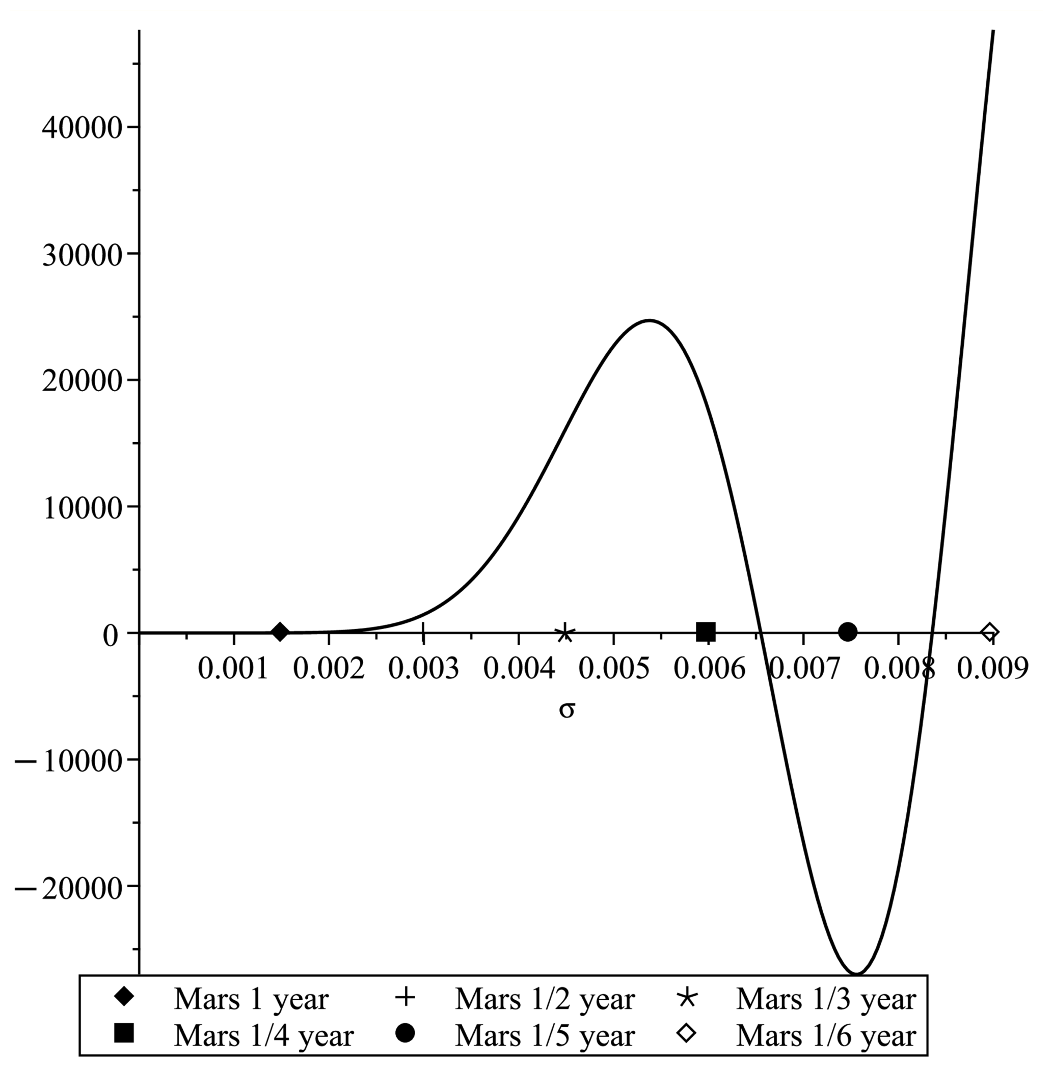 Figure 5Determinant of the matrix ALOD involved in the system of Eqs. (22), showing the resonances where the curve is crossing zero. The x axis represents the frequencies in cycles d−1. The LOD seasonal periods are shown with the symbols expressed in the legend.