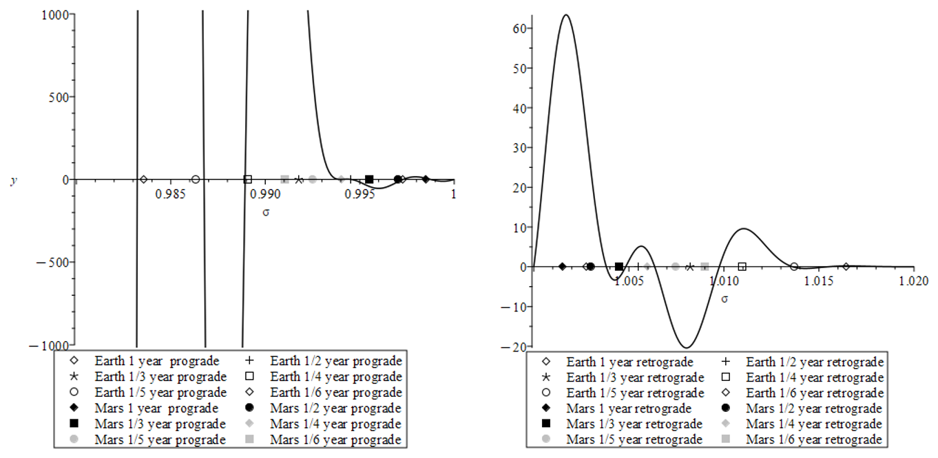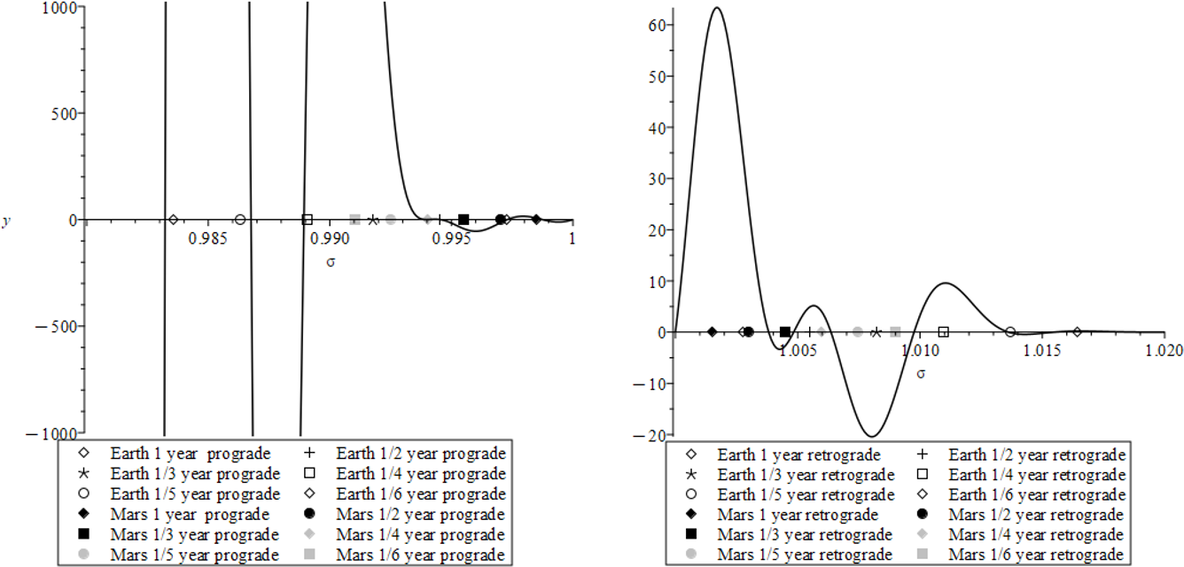 Figure A1Determinant of the matrix Anut involved in the system of Eqs. (14), showing the resonances where the curve is crossing zero. The nutation periods are expressed in a frame tied to the planet (in the diurnal frequency band). The prograde nutations are shown on the left graphics and the retrograde nutations are shown on the right. The nutation periods are shown with the symbols in the legend.