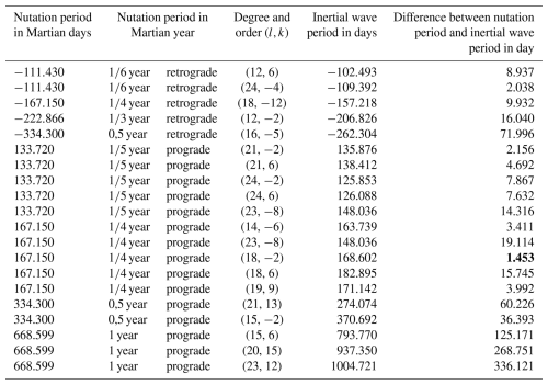 Table 1Principal resonances close to Martian nutations.
