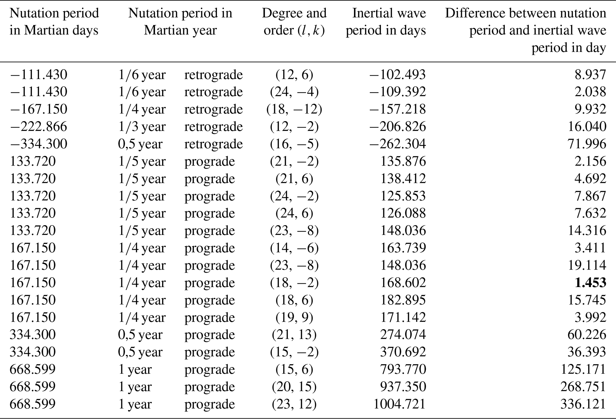 Also in the general case, the solutions for al±k exhibit resonances, determined by the roots of the corresponding l±k. Table 1 presents the inertial wave period (column 5), along with the degree l and order k of the spherical harmonics component of the topography generating them (column 4), as well as the potential nearby nutation period (columns 1, 2, and 3). The table also provides the difference, in days, between the nutation period and the inertial wave period (column 6).