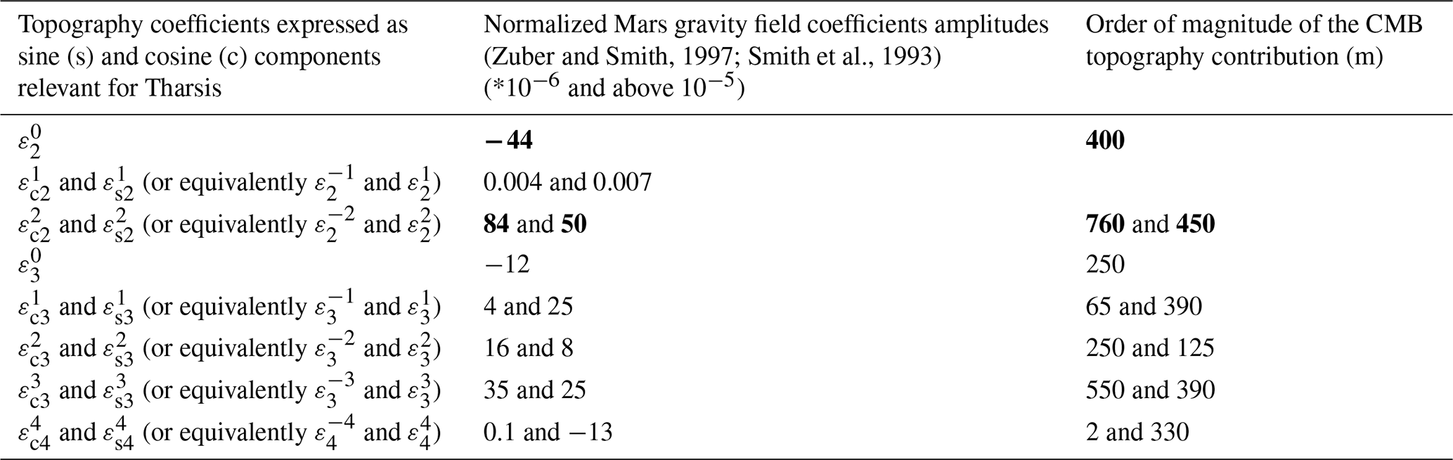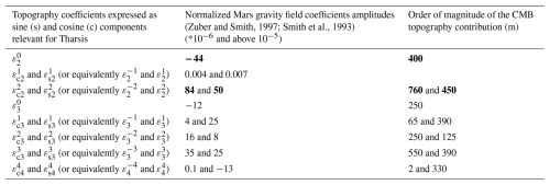 The chosen CMB topography includes in fact a contribution from the Tharsis mass anomaly, which is predominantly represented by degree-2, order-2 terms, followed by degree-2, order-0, and then degree-3, order-3 components, in decreasing order of amplitude. As shown in Table 2, the degree-2 terms are the most significant (in bold in Table 2). Other components (such as ε30, ε3-1, ε31, ε3-2, ε32, ε4-4 and ε44) are smaller than the degree-2 terms. Due to Mars' hemispheric dichotomy, the topography may also contain a significant degree-1 component, which we will account for in the following analysis. For that case, we use the computations of Wieczorek et al. (2019), who considered gravity anomalies within the lithosphere that perturb the shapes of the underlying hydrostatic density interfaces, including the core–mantle boundary.