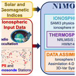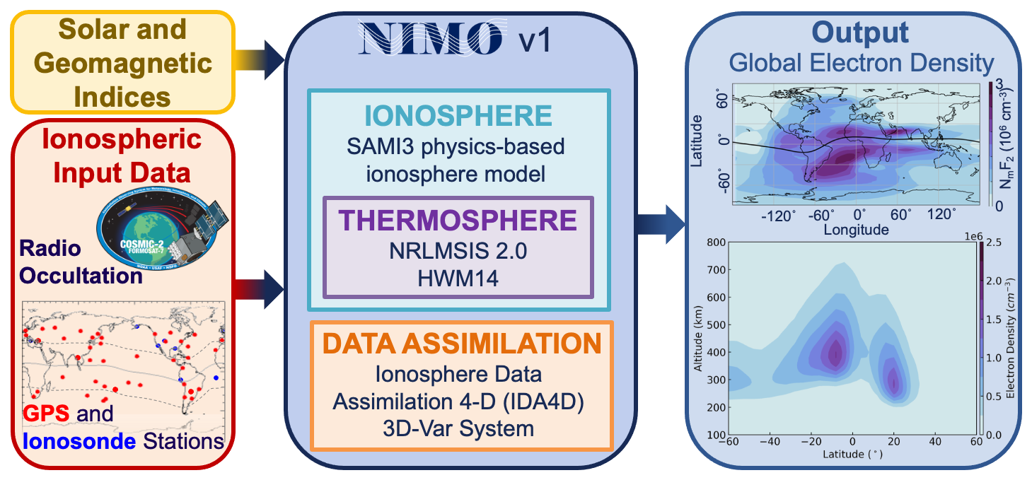 Figure 1NIMO consists of a data assimilation system, IDA-4D, and a physics-based ionosphere model, SAMI3. NIMO ingests a number of different data sets that can be represented as an electron density. The output is a 3D representation of the ionospheric electron density over the entire globe.