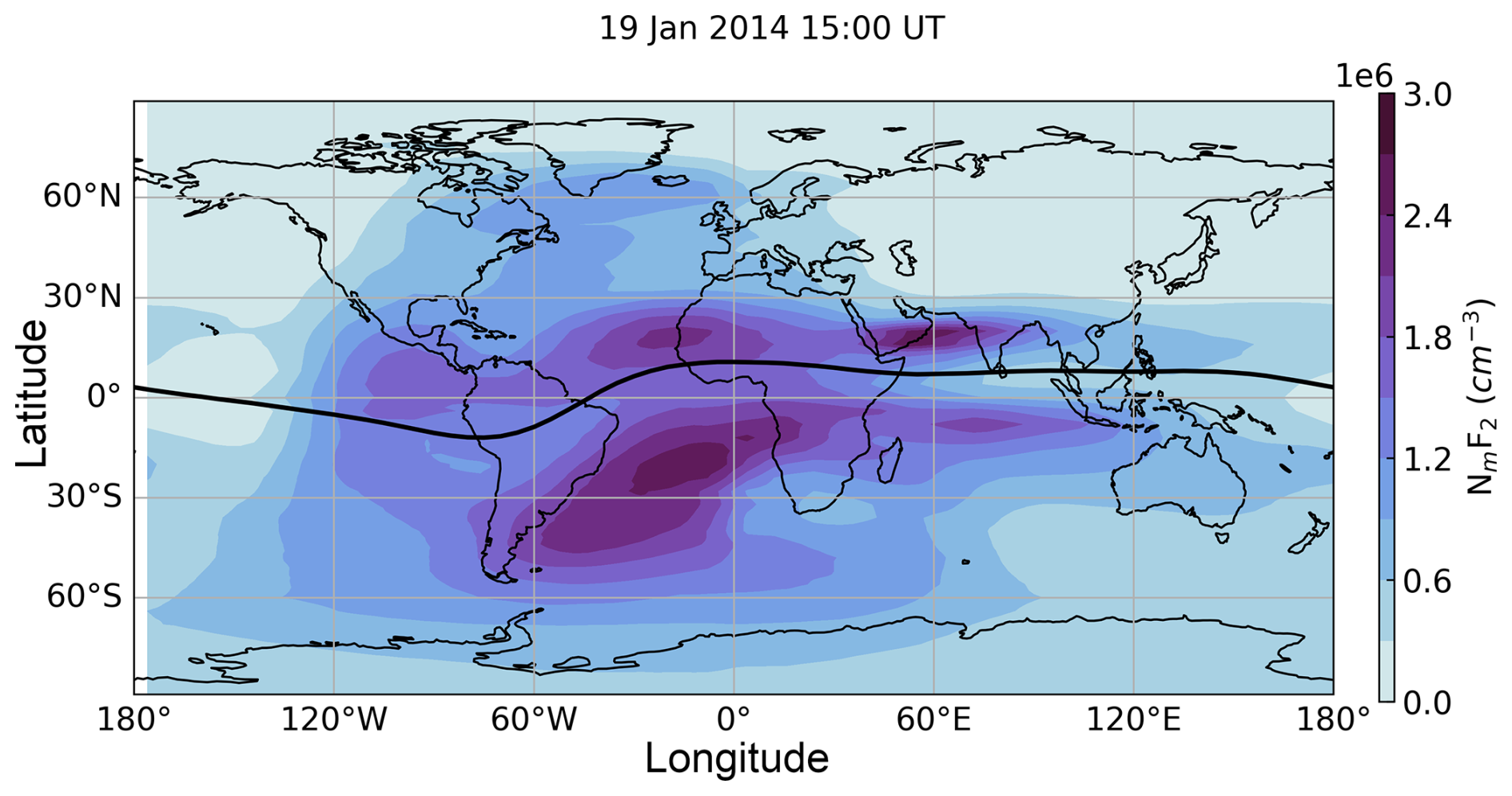 Figure 3NIMO specification of global peak electron density in the F region at 15:00 UT for 19 January 2014.