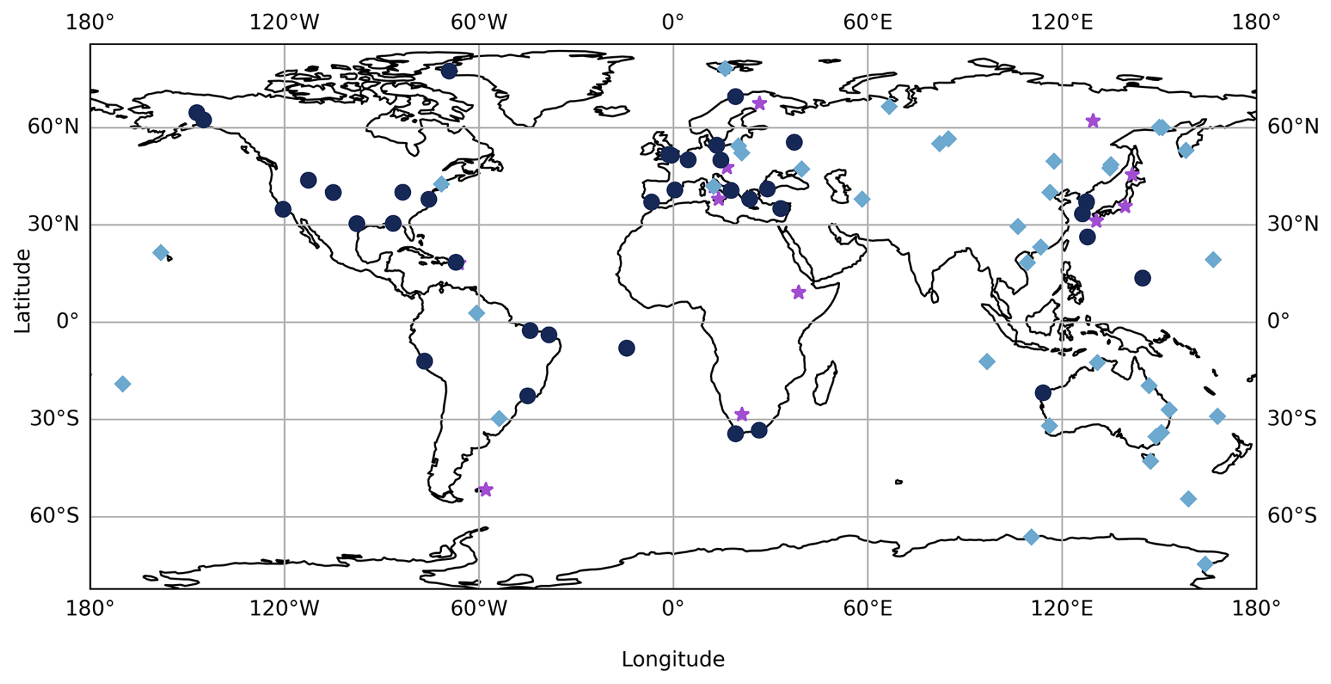 Figure 4Map of ionosonde locations used for data assimilation and validation. The purple stars are sites that are only used for data assimilation. The light blue diamonds are sites that are used for validation only. The navy circles are sites that are used for ingestion and validation.
