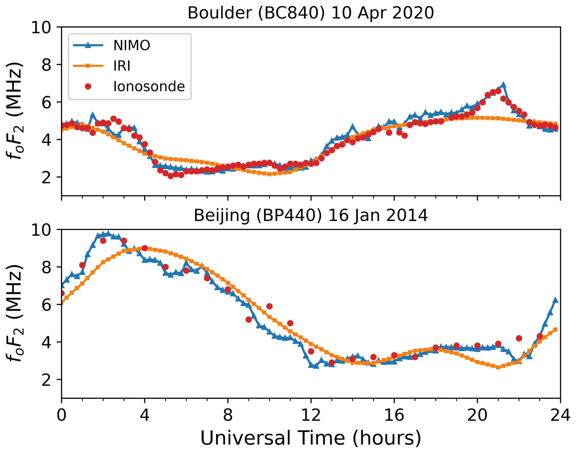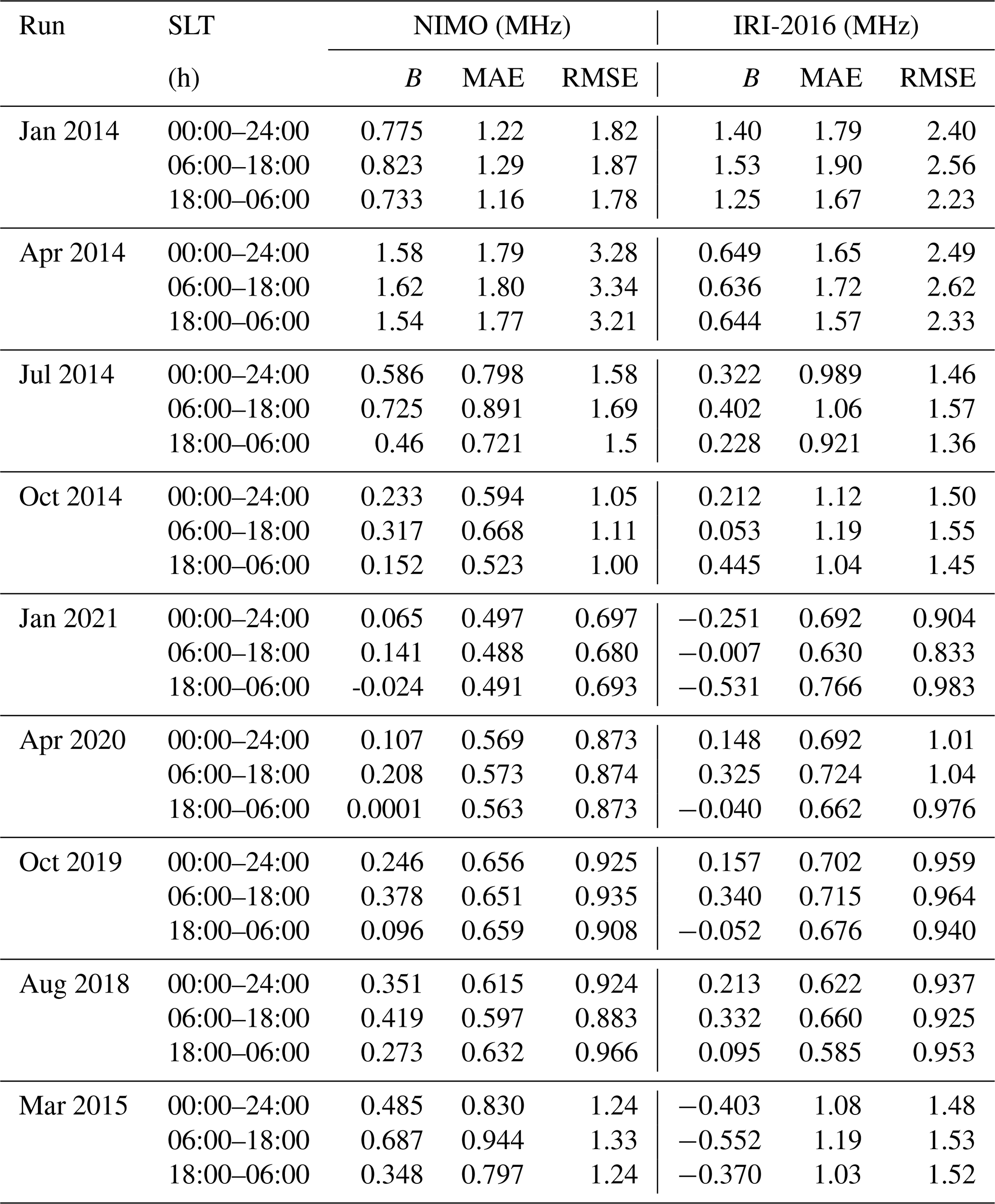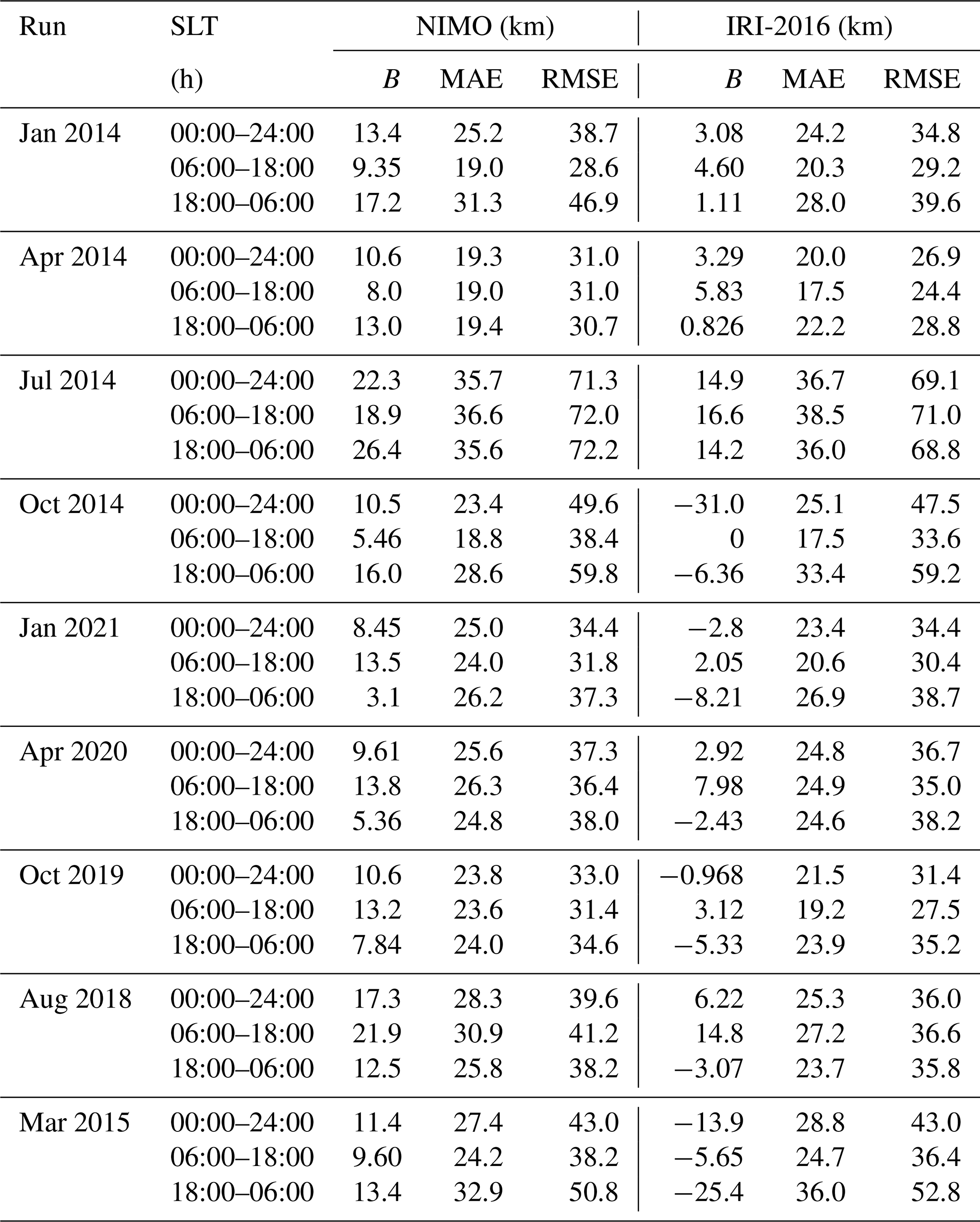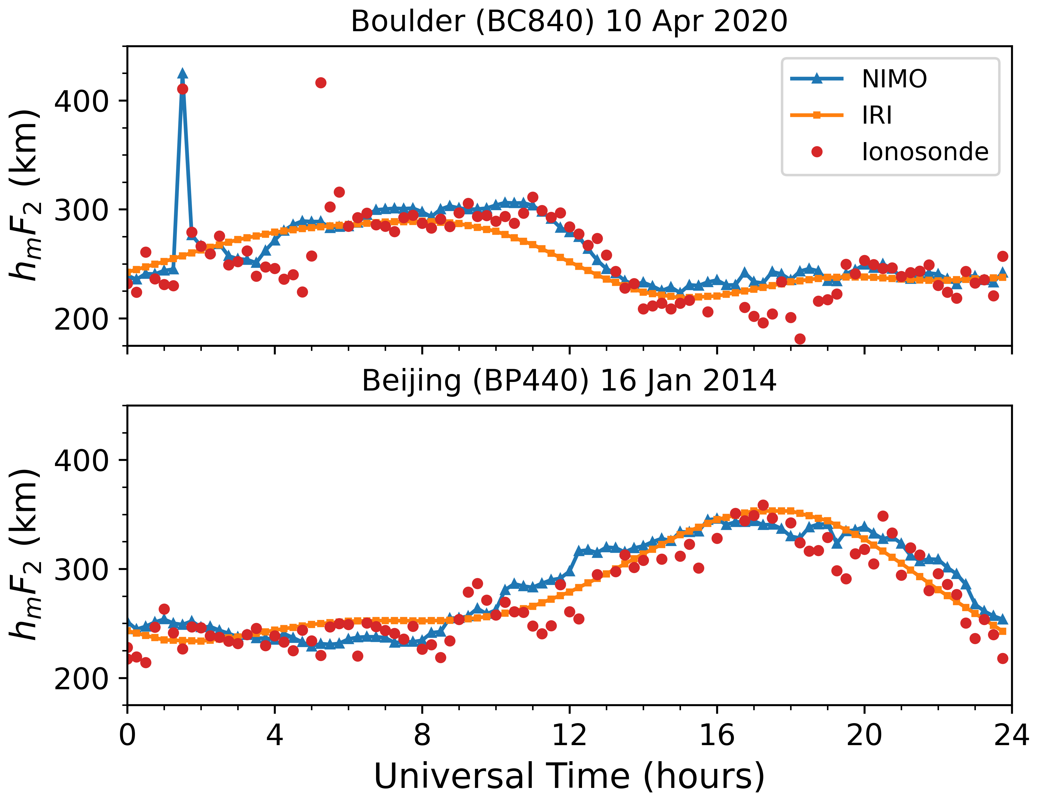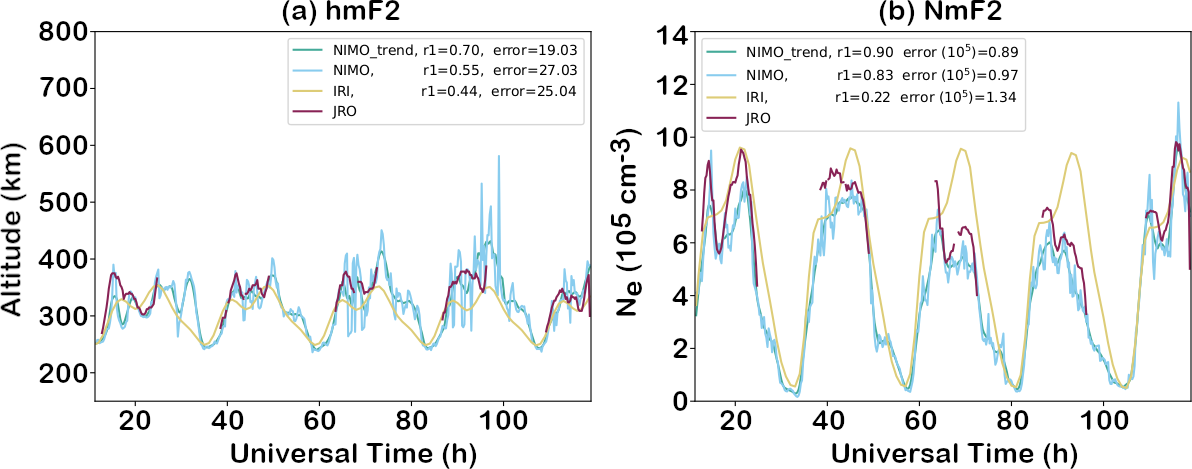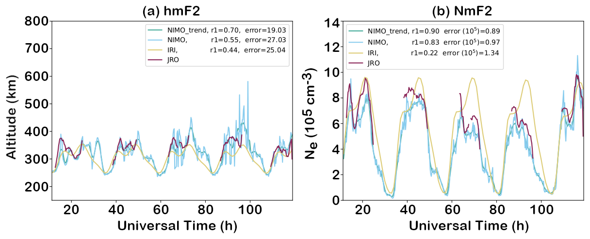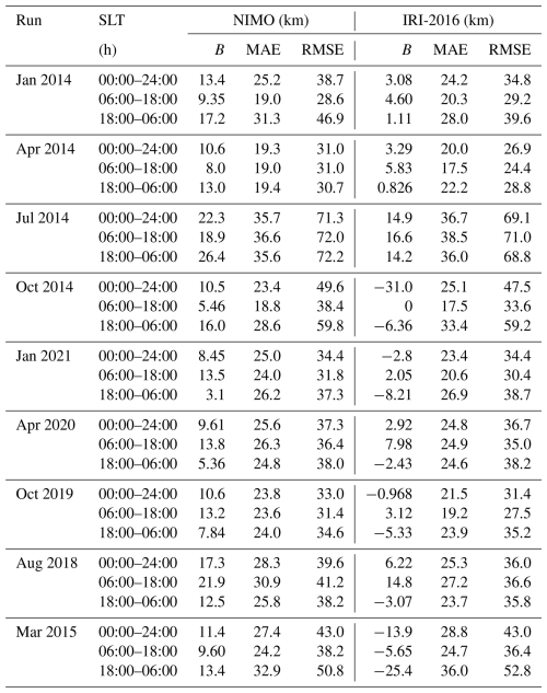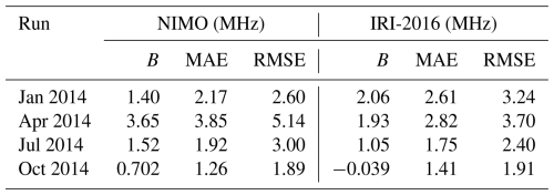The ionosonde validation showed no consistent local time variations in the relative performance of the two models. It found that NIMO performed better than IRI-2016 when modeling the foF2, while IRI-2016 did slightly better at modeling the hmF2. The only exception is times with geomagnetic storms, where NIMO consistently modeled the F2 peak characteristics better than IRI-2016. In Fig. 7 at around 01:30 UT the model matches an unrealistic hmF2. This problem comes from how the ionosonde data is quality controlled and how IDA4D assimilates the data. Work is ongoing to improve cleaning of ingested data and how the data assimilation system handles outlier data.